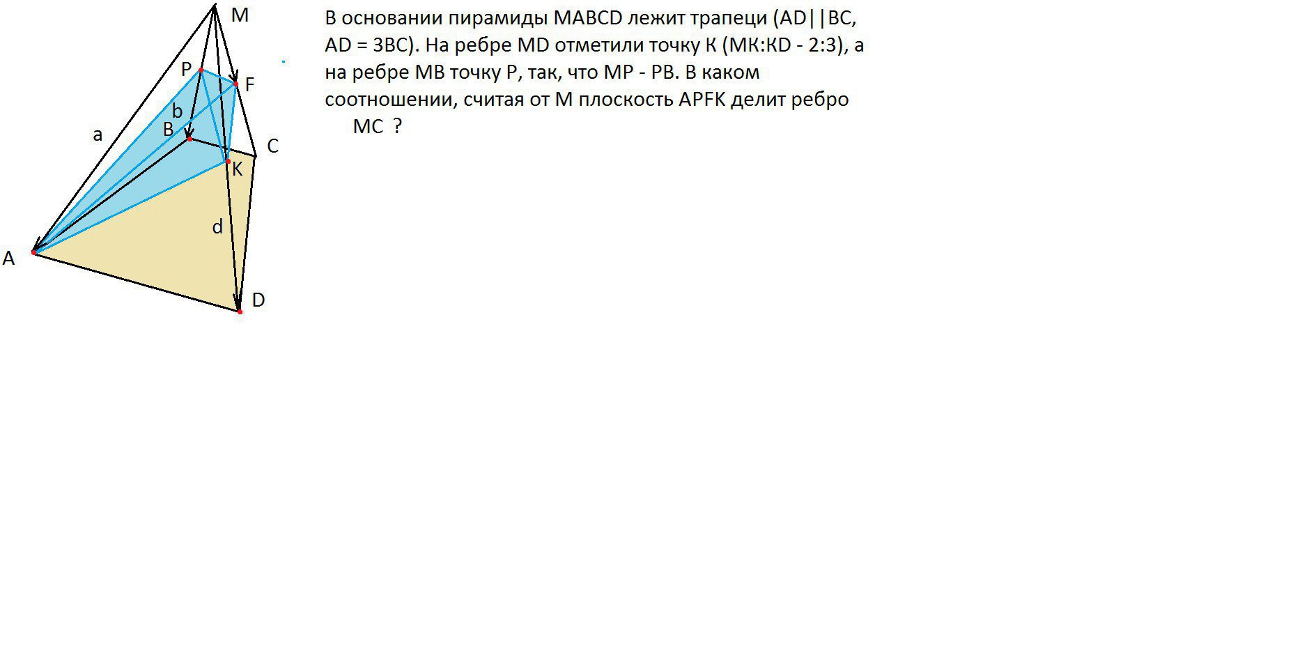 В основании пирамиды лежит трапеция. В каком соотношении сечение делит ребро МС?