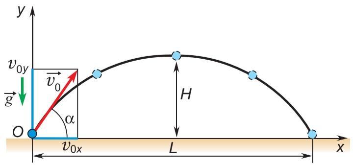 В начале движения тела с начальной скоростью ( v0 ) проекция которой на ось Ох ( v0x ) равна ( v0cosα ) , a на ось Оу ( v0y ) равна ( v0sinα )