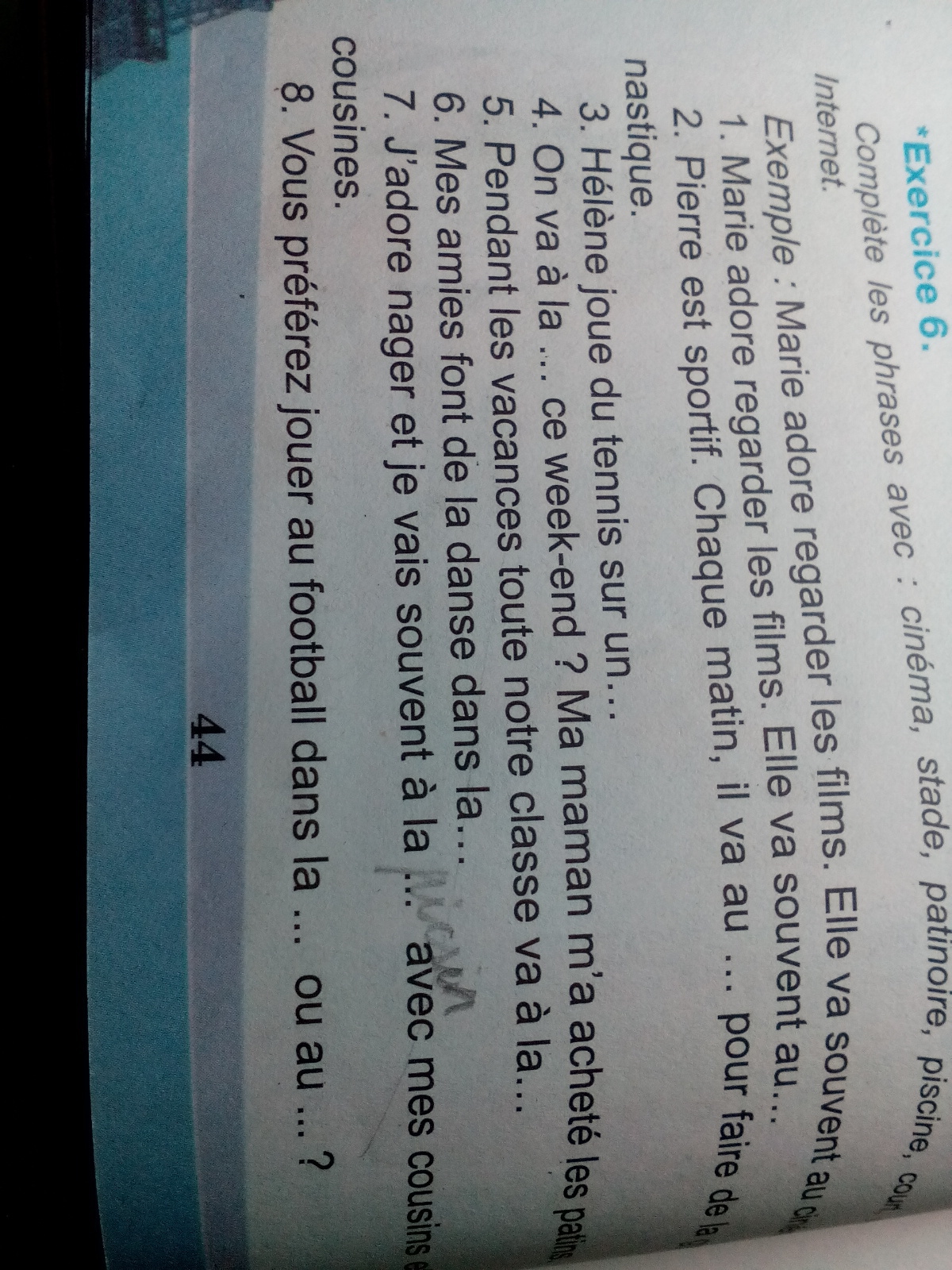 Восьмое предложение. Слова, которые можно вставить: à la piscine, á la patinoire, à la bibliotheque, au cinema, au stade, sur un court