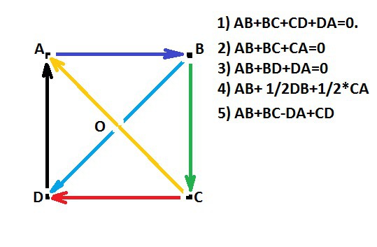 Точка 0- Центр квадрата ABCD. Найдите какие-нибудь семь попарно неравных векторов с концами и началами в точках A, B, C, D, O, сумма которых равна