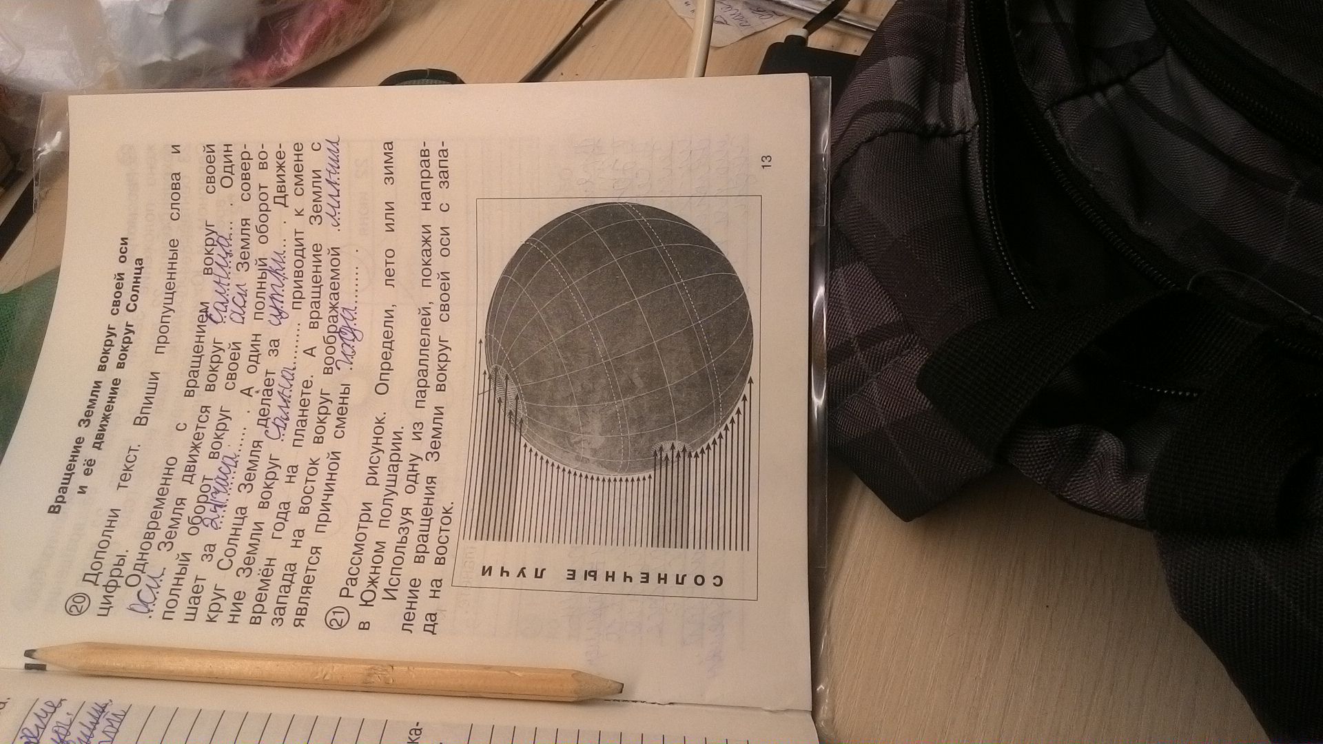 рассмотри рисунок. определи, лето или зима в южном полушарии. используя одну из параллелей, покажи направления вращения земли вокруг своей оси с завода на восток