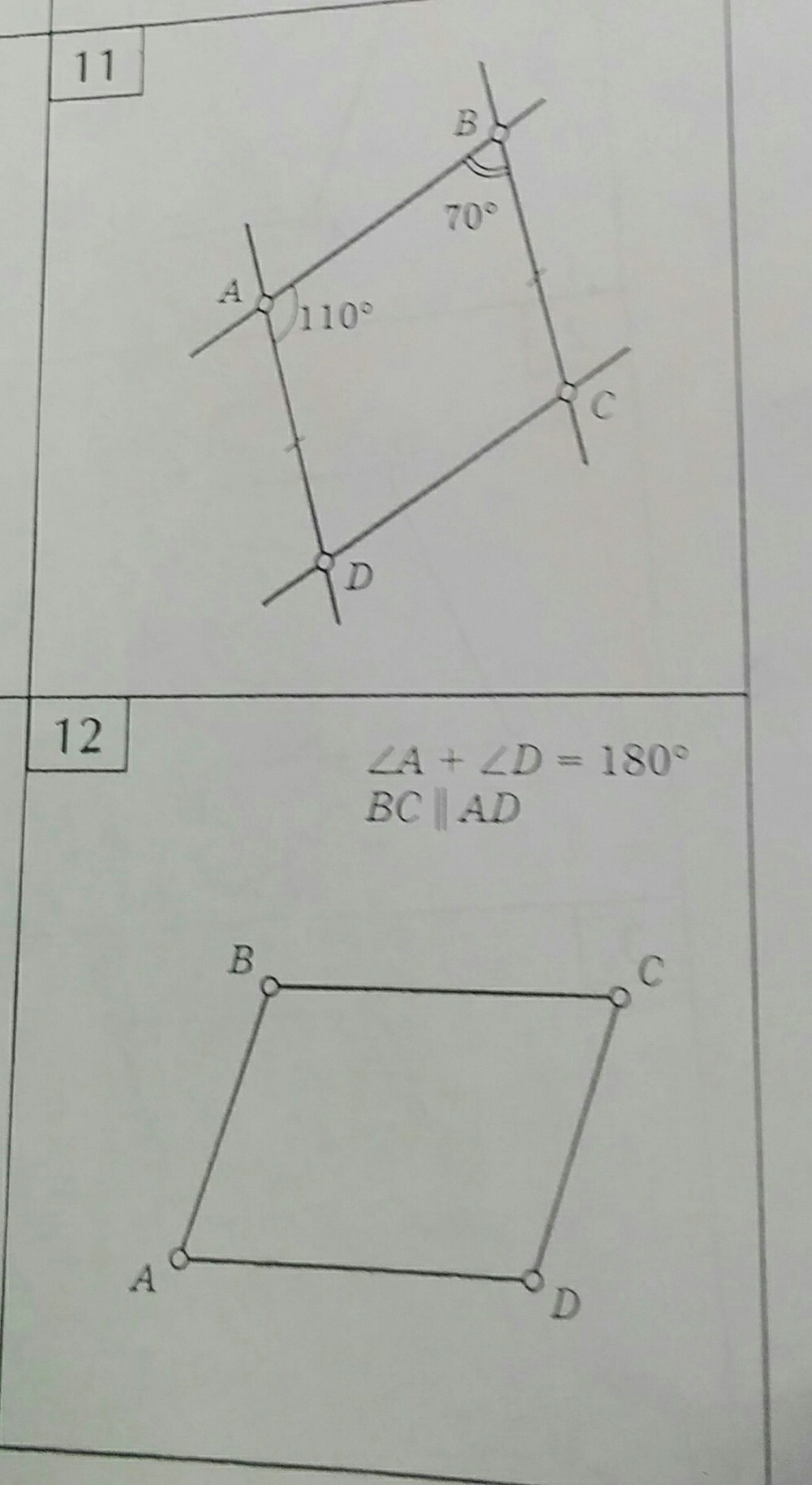 11 рисунок: 1) Углы A и B одностороннии, а их сумма равна 180 градусов, а значит эти углы лежат при пересечении параллельных прямых АD и DC секущей AB, то есть AB параллельно DС.
