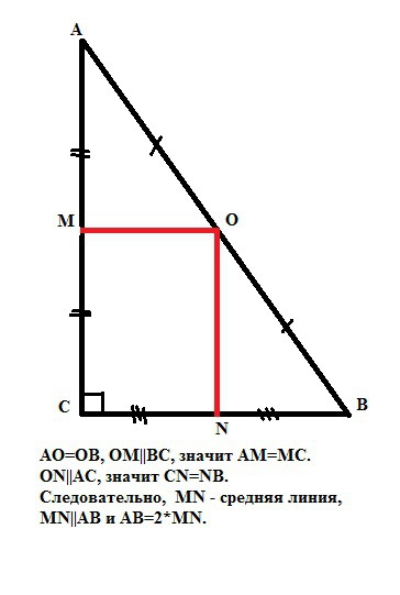 Через середину О гипотенузы АВ прямоугольного треугольника АВС проведены прямые, параллельные его катетам. Одна из них пересекает катет АС в точке М, другая – катет ВС в точке N. Найдите гипотенузу АВ, если MN = 7 см.
