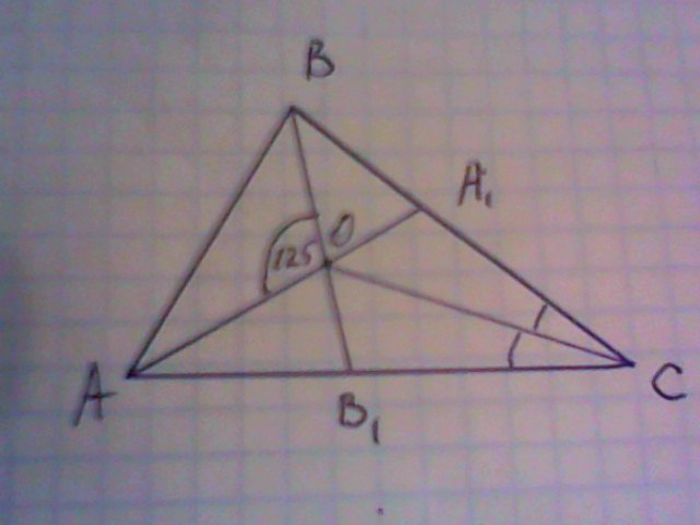 Биссектрисы AA1 и BB1 треугольника ABC пересекаются в точке O. Найдите угол ACO, если угол AOB=125