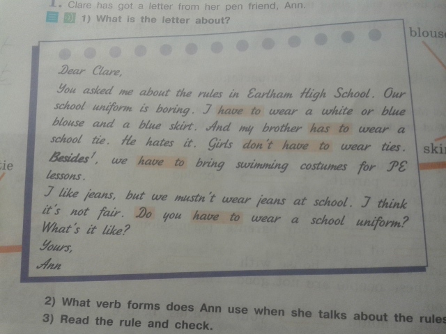 Вы спрашивали о правилах в Eartham средней школы. Наша школьная форма скучна, J должен носить белую или синюю блузку и синюю юбку. И мой брат должен носить школьный галстук. Он ненавидит его. девушки не должны носить галстуки. Кроме. мы должны принести плавательные костюмы для уроков PE. J как джинсы, но мы не должны носить джинсы в школе. J думаю, что это не справедливо. Есть ли у вас носить школьную форму? На что это похоже? С уважением,