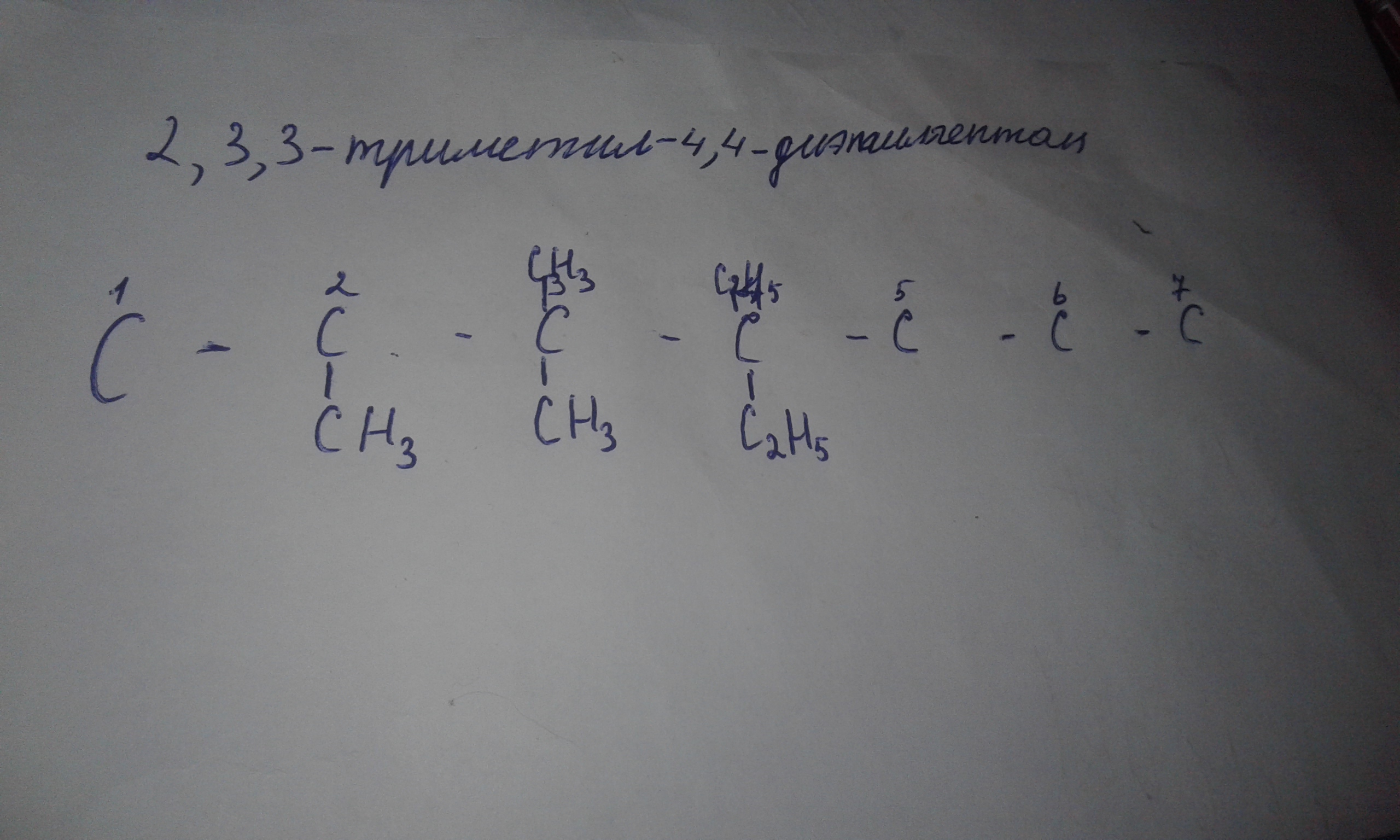 Напишите структурную формулу и обьясните пожалуйста, как именно записывать подобные соединения - 2,3,3 триметил 4,4 диэтил гентан. Что там к чему присоединяется?