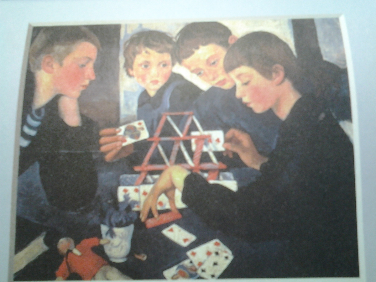 насколько много радости и счастья в этой картине, можно понять, если сравнить ЗА ЗАВТРАКОМ с ее же картиной КАРТОЧНЫЙ ДОМИК., написанной в 1919г. ..