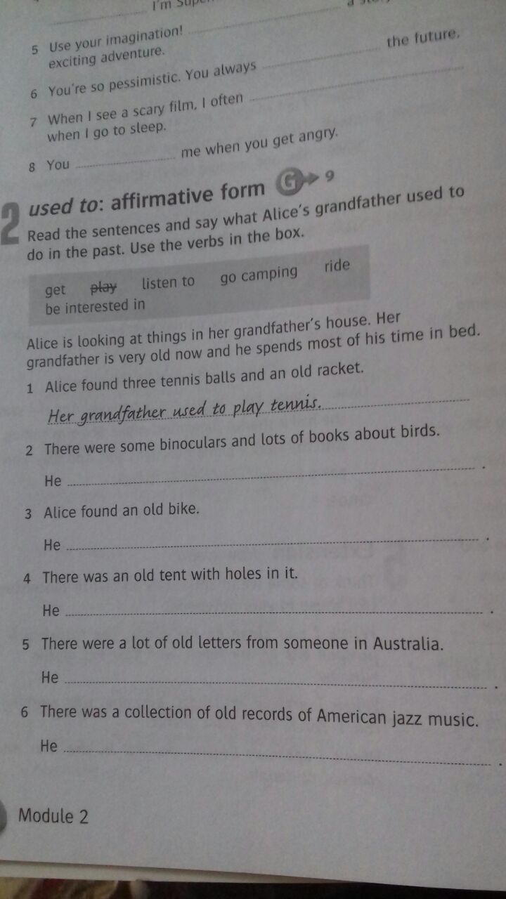 2) He used to be interested in birds. 3) He used to ride a bike. 4) He used to go camping. 5) He used to get letters from someone in Australia. 6) He used to listen to American jazz music.