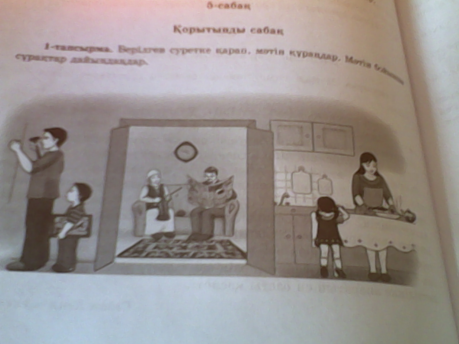 Менин жануямда алты адам бар.Биз каладагыкоп кабатты уйлерде турамыз.Атам ,ажем,акем анам карындасым жане мен. Ата бос уакытта газет окиды,ал эжем токумен айналысады.Мен сабактан келген сон сабагымды окып алып ,акеме комектестим,екеумиз жарга картина илдик.Карындасым анама ас уйде ас азирлеуге комектести биздин жан уямыз бос уакытымызды кызыкты откиземиз.