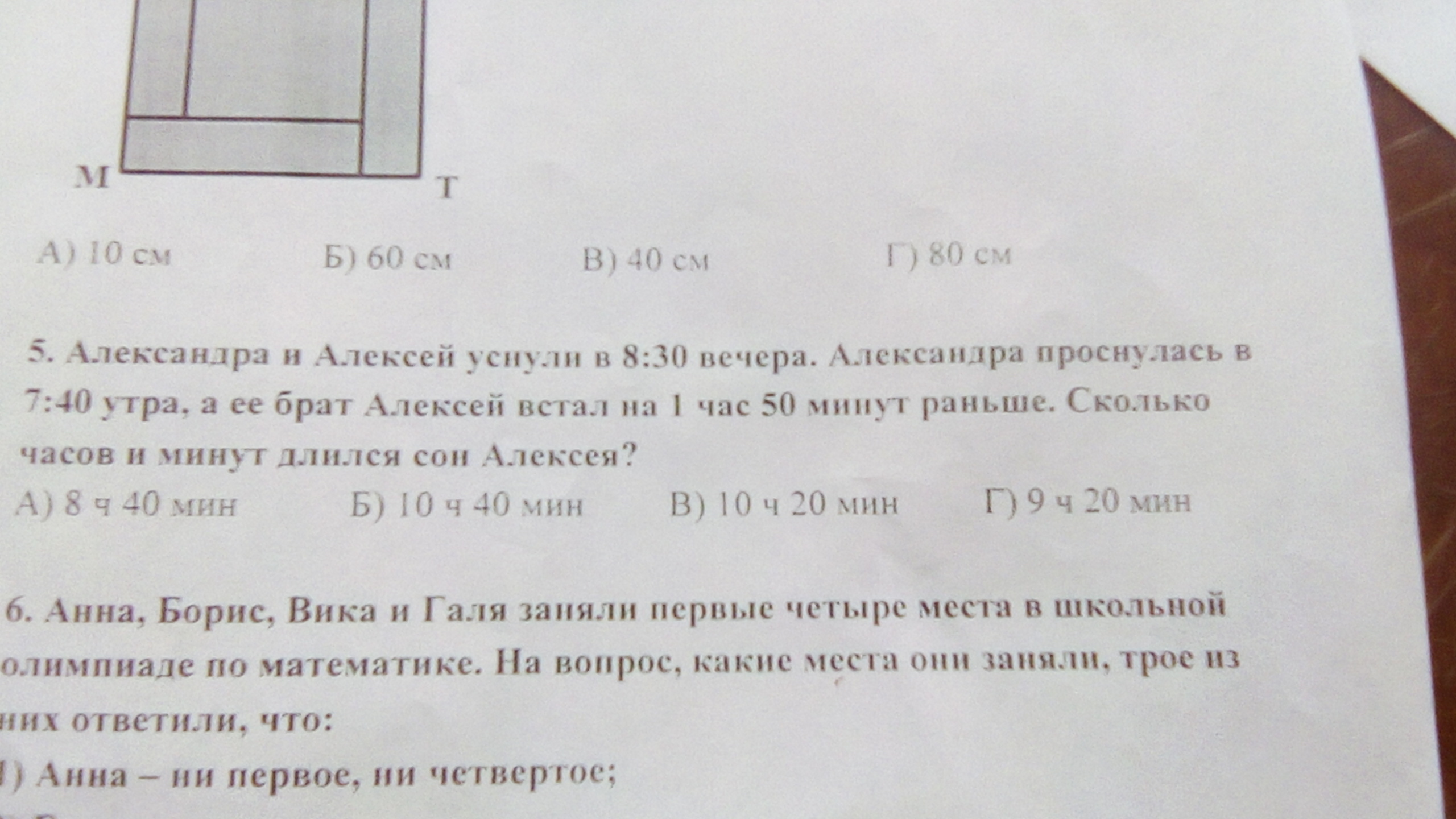 и так по скольку они уснули в 8:30 вечера александра проснулась в 7:40 переведём 7 часов 40 минут + 1 час 50 минут = 8 часов 40 минут следовательно выбирайте ответ под буквой б)