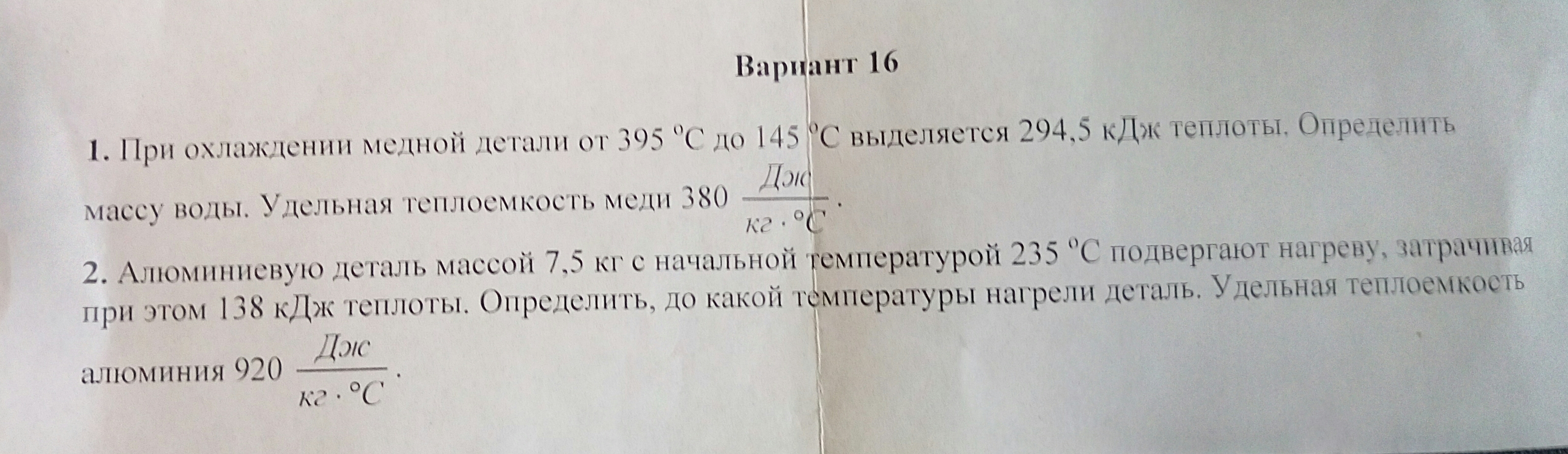 Q=cmΔT => m=Q/cΔT=294.5⋅10^3/380⋅(395-145)=294.5⋅10^3/380⋅250=294.5⋅10^3/95⋅10^3=3.1кг. Q=cmΔT => Q=cm(t-t0) => t-t0=Q/cm => t-235=138⋅10^3/7.5⋅920=138⋅10^3/6.9⋅10^3=20 => t=20+t0=20+235=255