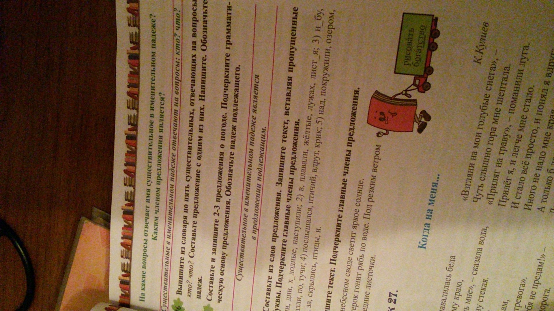 Наступили холодные дни. Главные члены: Дни-подлежащее, наступили-сказуемое. В лужах плавали жёлтые листья. Главные члены: листья-подлежащее, плавали-сказуемое. По небу ползли тучи. Тучи-подлежащее, ползли-сказуемое. Вдруг послышался птичий крик. Крик-подлежащее, послышался-сказуемое.