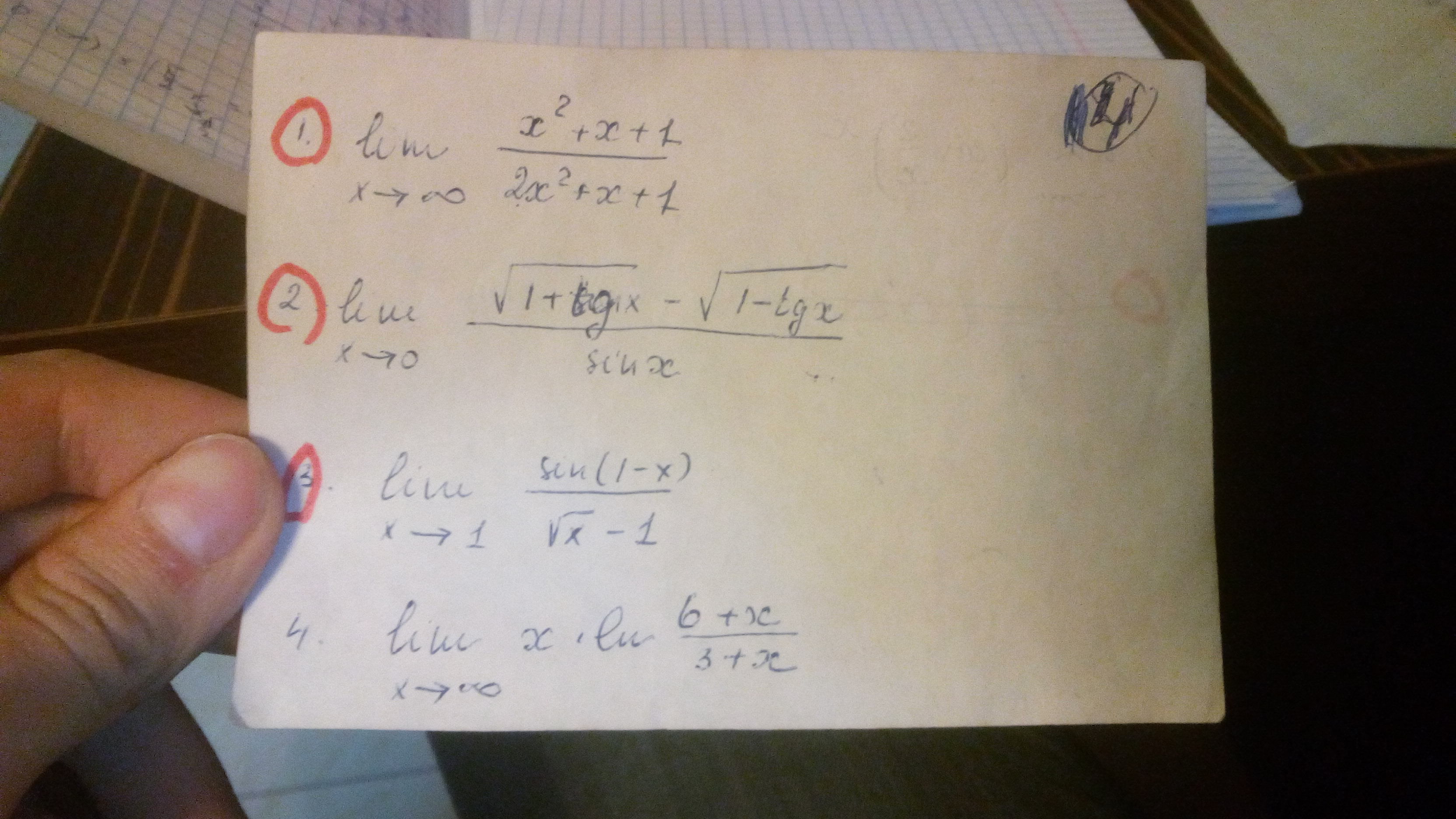 1)lim x²+x+1/2x²+x+1=[∞÷∞]=lim x²(x²/x²+x/x²+1/x²)÷x²(2x²/x²+x/x²+1/x²=lim 1+1/x+1/x²÷2+1/x+1/x²=1+0+0÷2+0+0=1/2