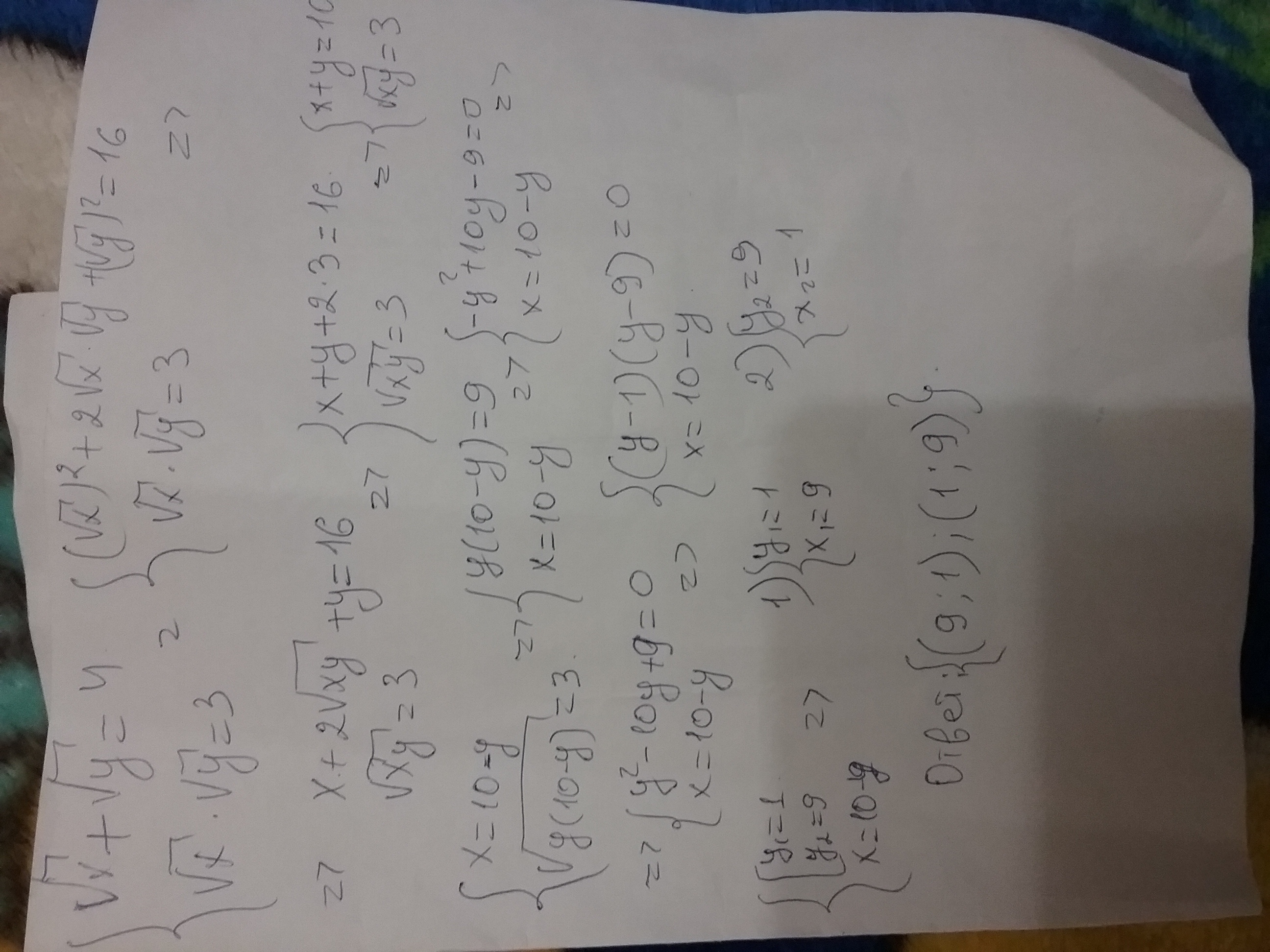 √х·√у= √х·(10-х)=3 или 10х- х²=9, -х²+10х-9=0 ,х²-10х+9=0