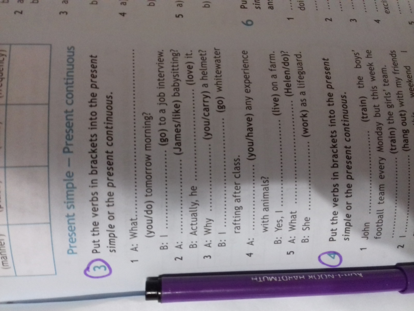 3. 1)A-Are you doing B-am going. 2)A-Does James like, B-loves 3)A- are you carrying B-am going 4)A-do you have B-live 5) A-are Helen doing, B-is working