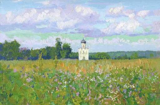 Живописный этюд молодого московского художника Семена Кожина, созданный уже в нашем веке, по замыслу и исполнению перекликается с одноименным полотном А. Герасимова. Центром горизонтально вытянутой композиции является белокаменная церковь. Те же родные просторы: леса и поля, цветущие травы, - то же небо с пышными ленивыми облаками, которые подгоняет легкий ветер. Только молодой автор отправился к церкви не по берегу реки, а шел из окрестной деревеньки через луг. Храм в его произведении трепещет вдали, сливаясь с белизной небес и синеющей далью.