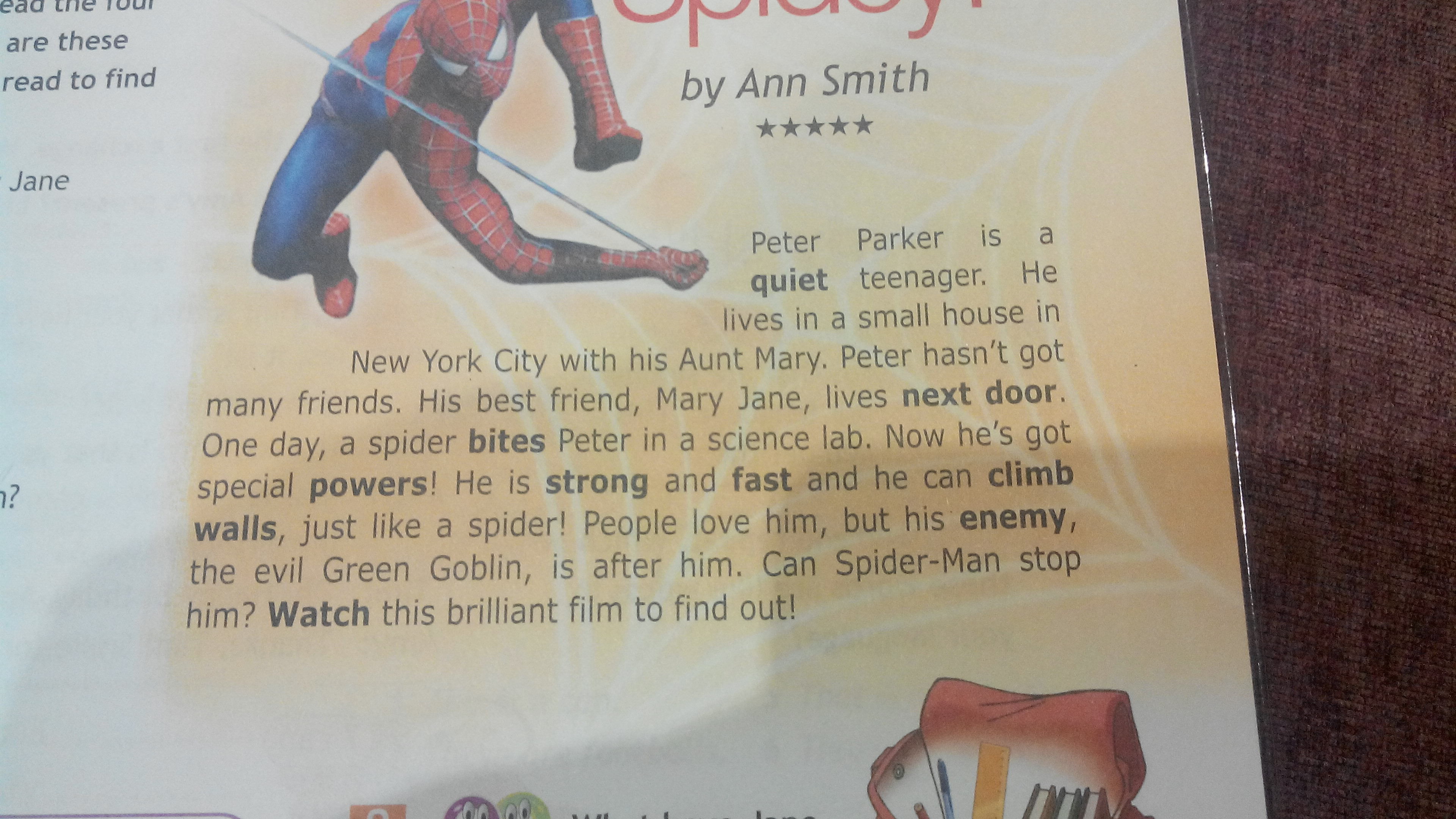 Питер Паркер - тихий подросток. Он живет в небольшом доме в Нью-Йорке со своей тетей Мэри. У Питера не много друзей. Его лучший друг, Мэри Джейн, живет по соседству. Однажды, паук кусает Питера в научной лаборатории. Теперь у него появляются особые способности! Он стал сильным и быстрым, и он может передвигаться по стенам, как паук! Люди любят его, но его враг, злой Зелёный Гоблин преследует его. Сможет ли Человек-паук остановить его? Посмотрите этот великолепный фильм, чтобы узнать всё это!
