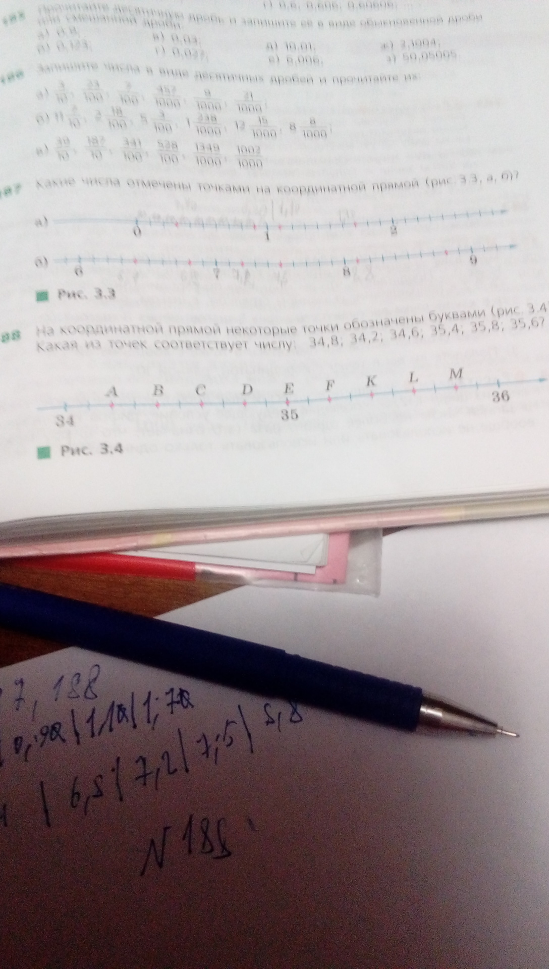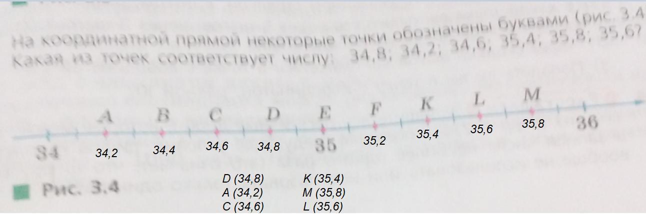 На координатной прямой некоторые точки обозначены буквами(рис3.4) какая из точек соответствует числу 34,8 ; 34,2; 34,2; 34,6; 35,8; 35,6 ?