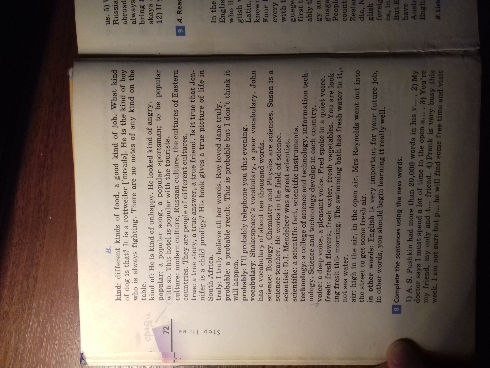 вид: различные виды пищи, хорошая работа. Какиесобака такая? Это ротвейлер ('rotvarl) он же вроде мальчиккто всегда борется. Нет записей любого вида наТаблица.рода: он довольно несчастным. Он выглядел немного сердитым.популярное: популярная песня, популярный спортсмен: чтобы быть популярным(с ШБ. Этот отель пользуется популярностью у туристов.культура: современная культура, русская культура, культура Востокастран. Они люди разных культурправда: правдивая история, истинный ответ, верный друг. Это правда, что Дженnifer вундеркинд? Его книга дает истинную картину жизни вЮжная Африка.воистину: я искренне верю в свои слова. Рой любил Джейн.вероятнобудет.наверное: я, наверное, телефон вам в этот вечер.словарный запас: словарный запас Шекспира, бедный словарный запас. Джонимеет словарный запас около десяти тысяч слов.науки: Биология, Химия и физика-науки. Сьюзанучитель информатики. Не работает в области наукиученый: Д. и. Менделеев был великим ученым.научный: научный факт, научный инструментарий.технологии: колледж науки и технологии, Информационные технологиилогии. Наука и технологии развиваются в каждой стране.Голос: глубокий голос, приятный голос. Фред говорил тихим голосом.свежее: свежие цветы, свежая вода, свежие овощи. Вы не смотрите.инг утренние. Купальня имеет пресной воды: в ней,не морской воды.воздуха: высоко в воздухе, под открытым небом. Миссис Рейнольдс вышла вулицу, чтобы подышать свежим воздухом.другими словами, английский является очень важным для вашей будущей работы.другими словами, Вы должны начать очень хорошо его учить.