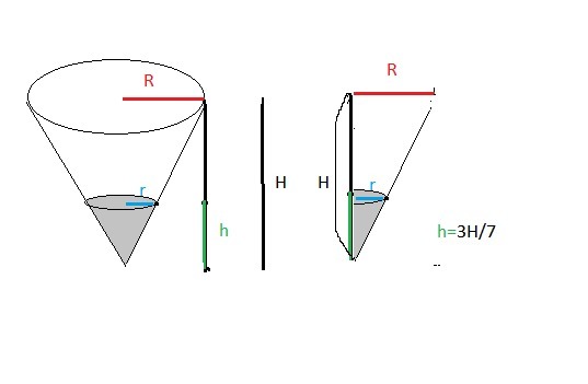 В сосуде, имеющем форму конуса, уровень жидкости достигает 3/7 высоты. Объём жидкости равен 270 мл. Сколько миллилитров жидкости нужно долить, чтобы полностью наполнить сосуд?