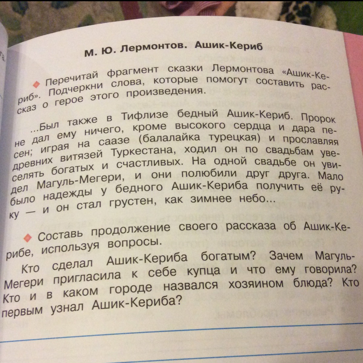 ...его песни стали грусны и печальны и его перестали звать на свадьбы.И вот однажды он снова встретил того пророка и стал жаловаться ему.На что пророк ответил:Но ведь у тебя уже есть богатство,но ты всеми силами пытаешься упустить его.И тут Ашик-Кериба всё понял!Его богатство-его дар пения.Тут неподалеку раздался голос нлашатого:Тот кто лучше всех споёт песню получит славу и богатства придворного музыканта!Ашик-Кериба спел,и победил став богаче и счастливее!