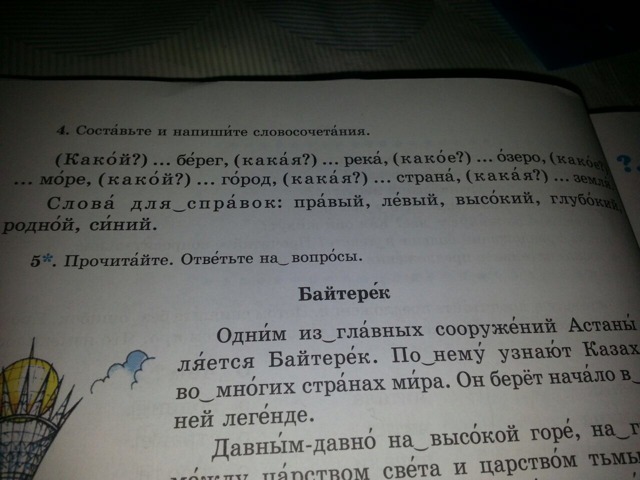 1) Большой берег, 2) длинная река, 3)маленькое озеро, 4)синее море, 5)красивый город, 6)большая, (маленькая), хорошая страна, 7)родная земля