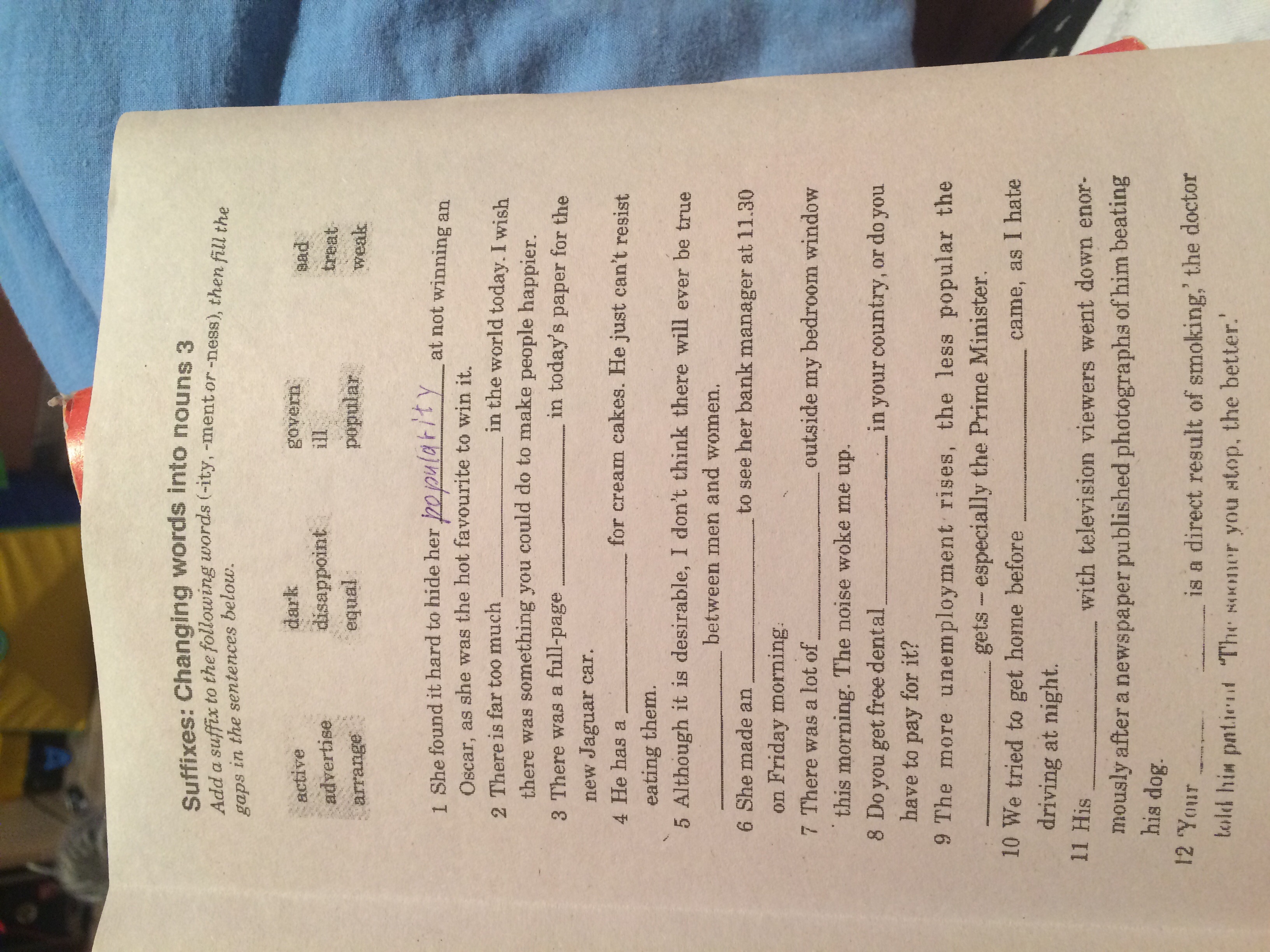 1 disappointment 2 sadness 3 advertisement 4 weakness 5 equality 6 arrangement 7 activity 8 treatment 9 government 10 darkness 11 popularity 12 illness
