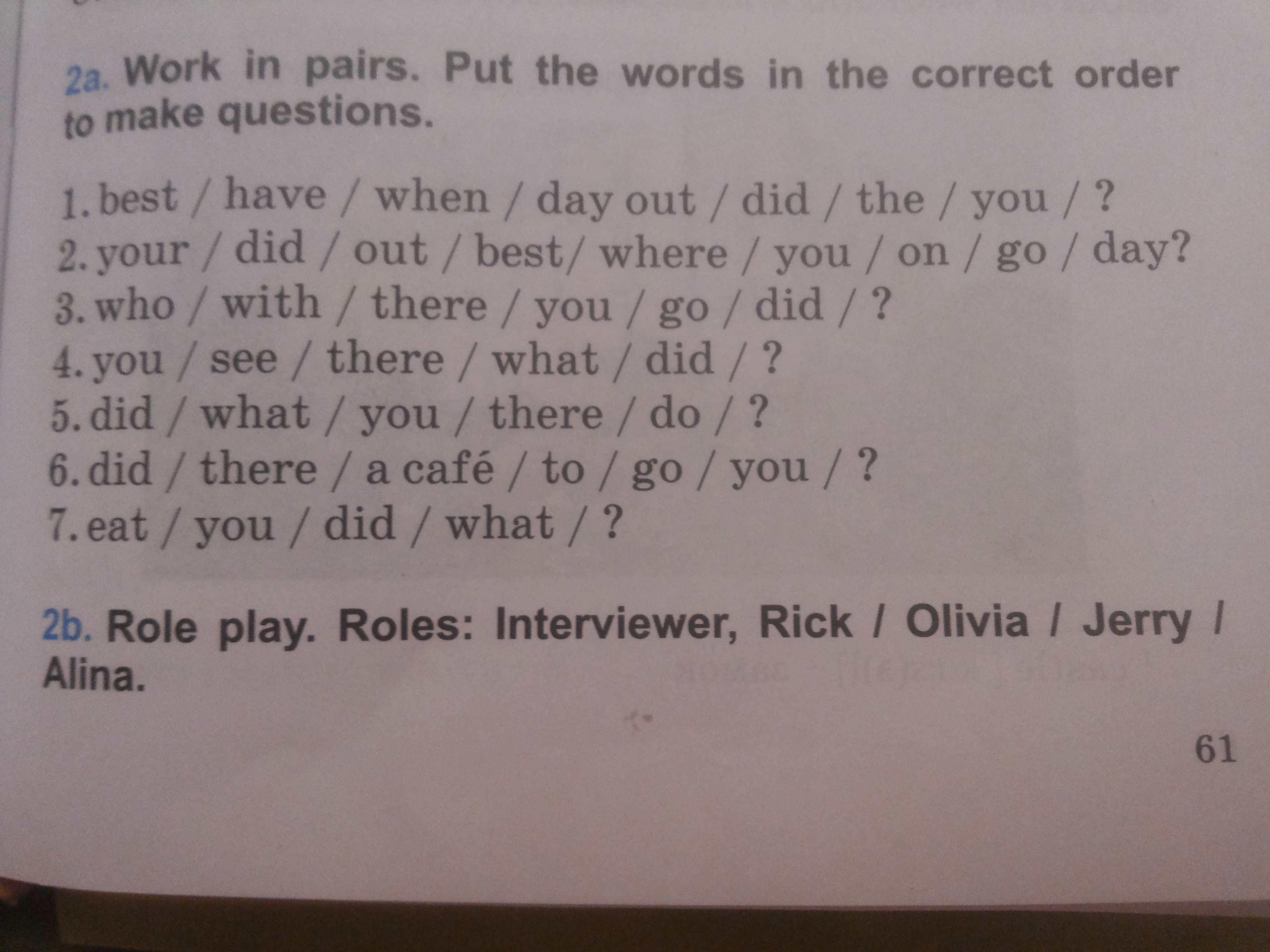 2a.Work in pairs. Put the words in the correct order to make guestions. 1.best/have/when/day out/did/the/you/? 2.your/did/out/best/where/you/on/go/day? 3.who/whit/there/you/go/did/?4.you/see/there/what/did/?5.did/what/you/there/do/?6.did/there/a café/to/go/you/?7.eat/you/did/what/?
