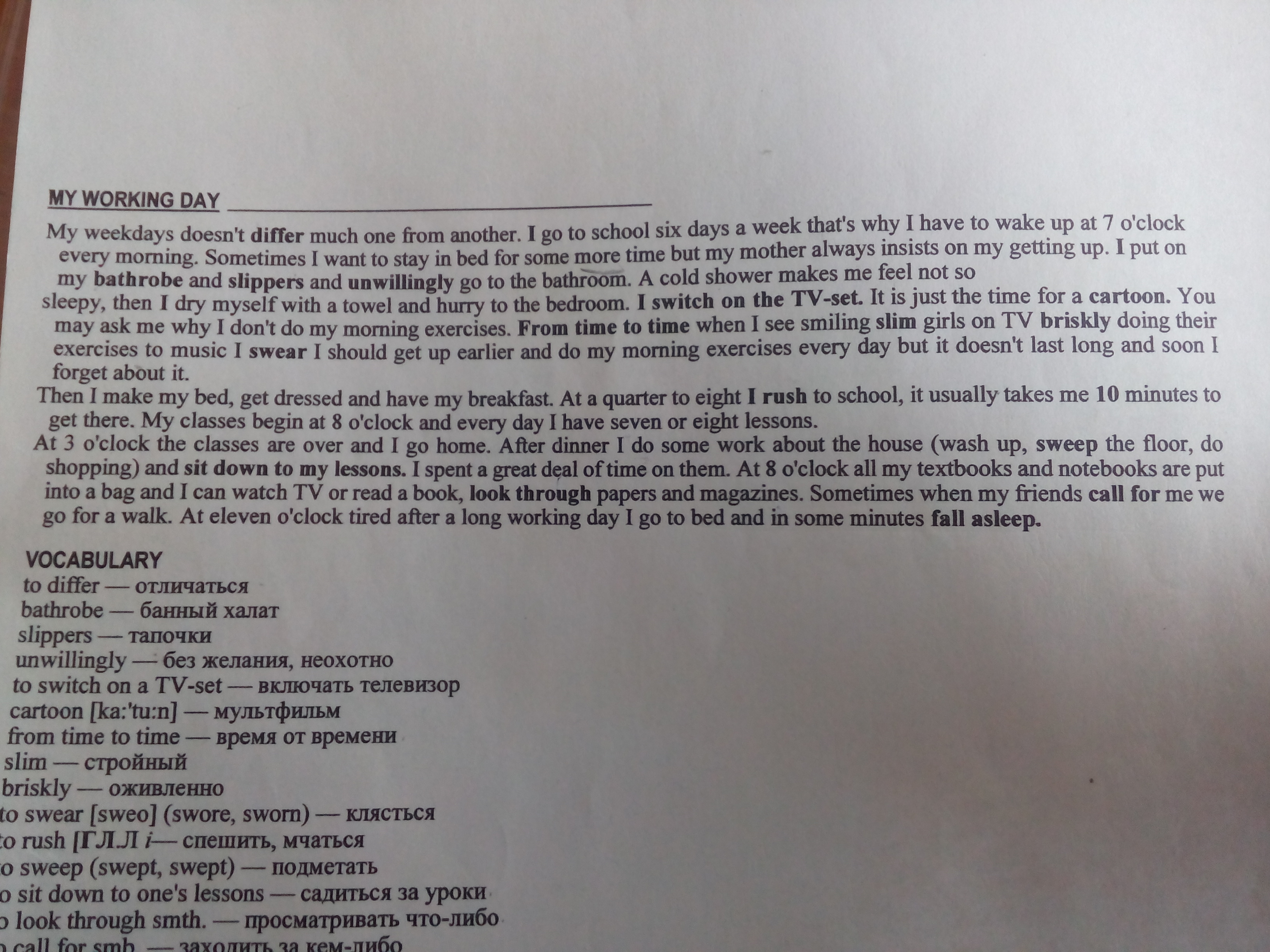 Мой рабочий день Мои не сильно отличается от другого. в школу шесть дней в неделю, поэтому я должен просыпаться в 7 часов утра. Иногда хотят остаться в еще какое-то время, но моя мать всегда настаивает на том, что я вставая. Ипуть на мой халат и тапочки и неохотно идут в ванную. Холодный душ заставляет меня чувствовать себя не так сонный, потом я вытереться полотенцем и спешит на это как раз время для мультфильма. Вы можете спросить меня, почему я не делаю утреннюю гимнастику. Время от времени, когда я вижу улыбающиеся девушки на тонкие делая их клянусь, что я должен вставать раньше и делать свои утренние упражнения каждый день, но это не продлится долго, и вскоре я забыл об этом. Тогда сойду, одевайся и есть мой завтрак. В четверти восемь я спешу в школу, она обычно занимает у меня 10 минут, чтобы добраться туда. Мои занятия начинаются в 8 часов и каждый день у меня есть семь или восемь уроков. В 3 часа занятия закончились, и я иду домой. После обеда я сделать некоторую работу по дому (вымыть, подметать пол, делать покупки) и сесть на мои уроки. Я потратил много времени на них. В 8 часов все мои учебники и тетради помещаются в сумку, и я могу смотреть телевизор или читать книгу, просматривать газеты и журналы. Иногда, когда мои друзья зовут меня мы идем на прогулку. В одиннадцать часов устал после долгого рабочего дня я иду спать и через несколько минут заснуть.