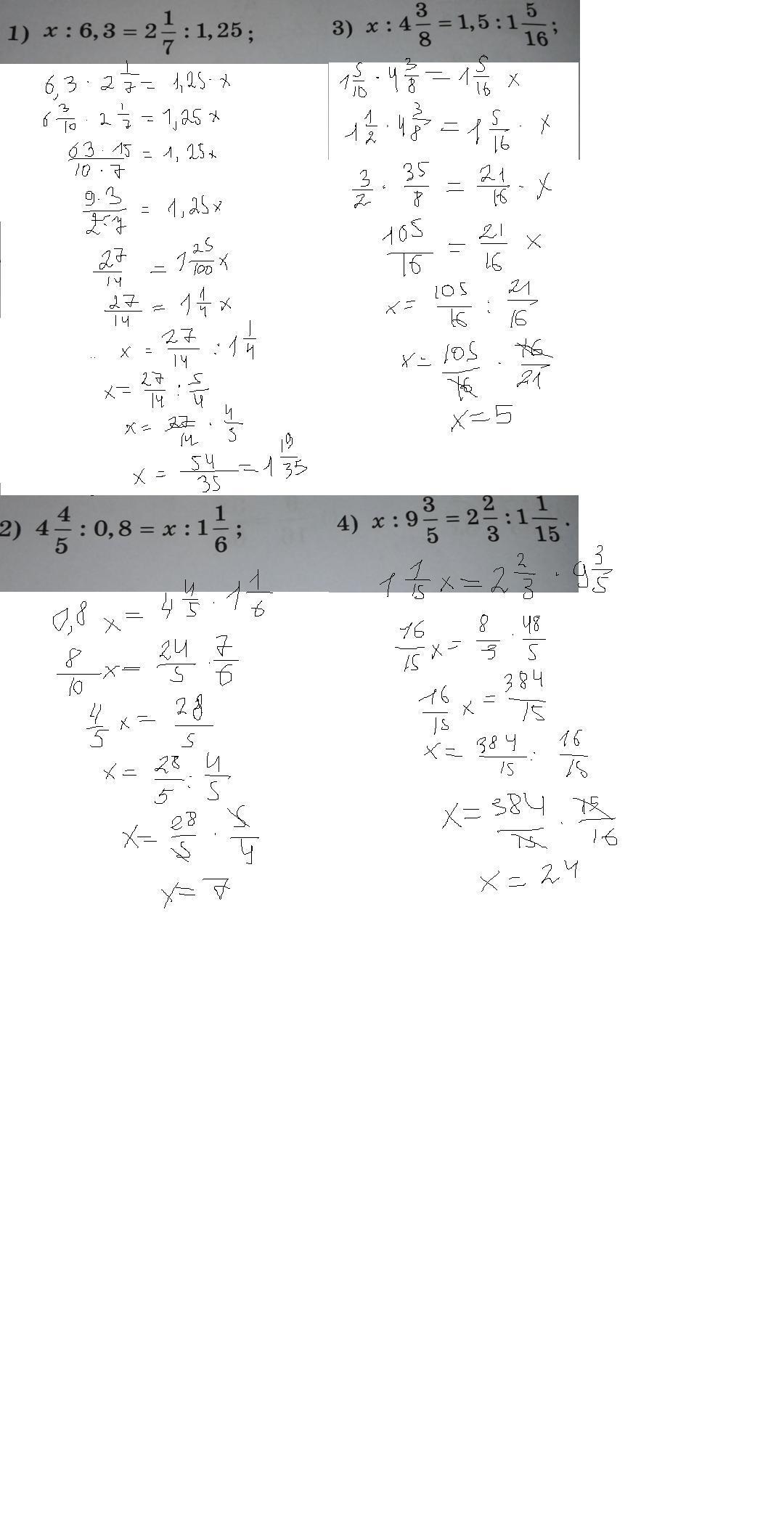 СРОЧНО: найдите неизвестный член пропорции : 1) x:6,3=2 1/7:1,25 2) 4 4/5:0,8=x:1 1/6 3) x:4 3/8=1,5:1 5/16 4) x:9 3/5=2 2/3:1 1/15
