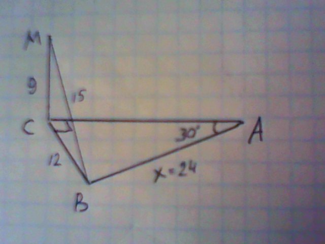 ΔАВС: ∠А=30°, АВ=2ВС=2·12=24 м.