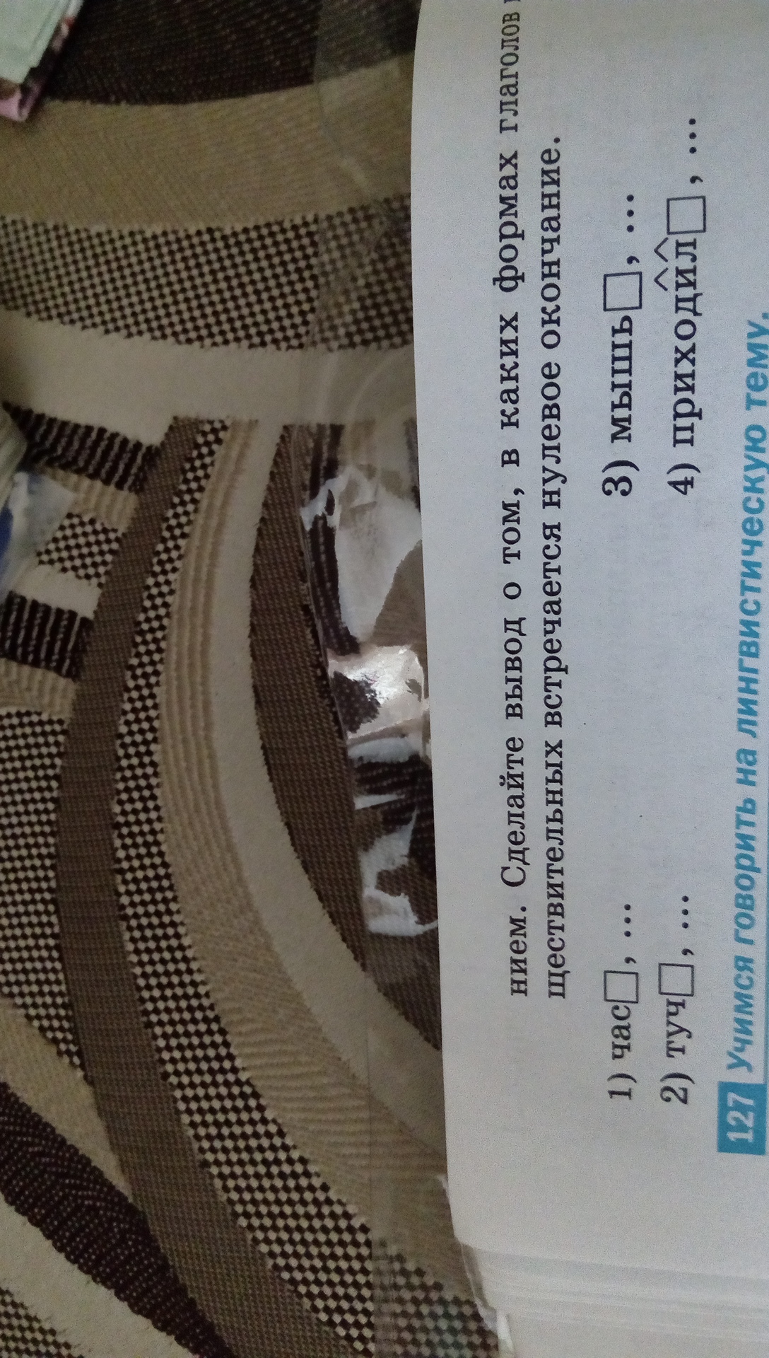 Определите, какое значение имеет нулевое окончание в каждом слове. Запишите по два примера слов с таким же окончанием. Сделайте вывод о том, в каких формах глаголов и существительных встречается нулевое окончание.