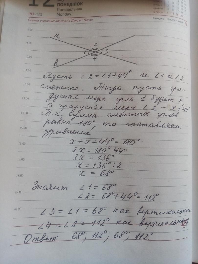 Даны две пересикающиеся прямые .Один из углов которые получаются при пересечении этих прямых на 44 градуса меньше другого .Найдите все углы образованные заданными прямыми .