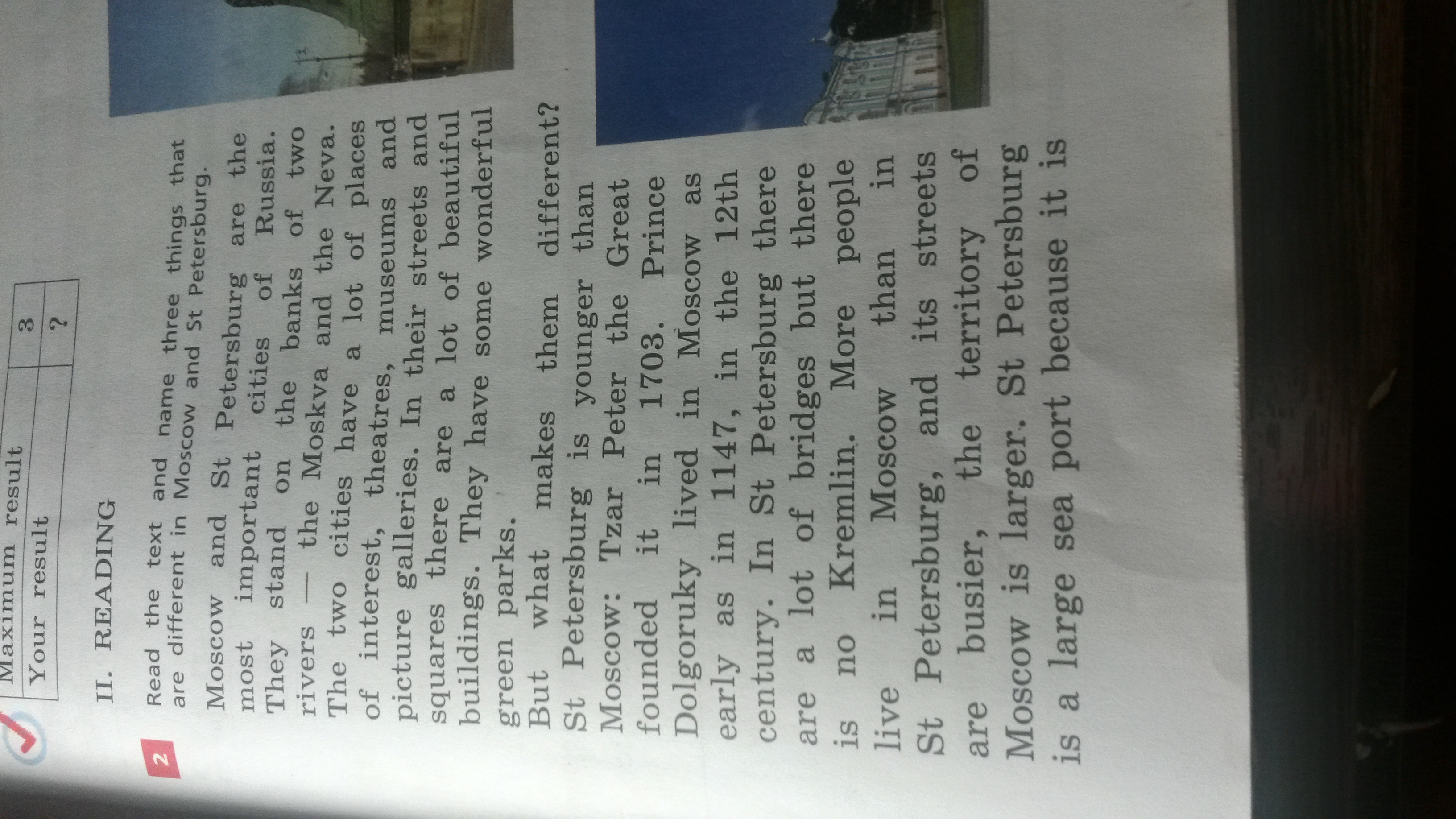 москва и питер самые важные города в россии. они стоят на двух реках — москва и нева. два этих города имеют много интересных мест, театров, музеев и картинных галерей. на их улицах много красивых строений. в городах есть немного чудесных парков. но что же их отличает. питер более молодой чем москва основан в 1703 году. принц долгорукий жил в москве так рано 1147 году 12 века. в питере много мостов но это не кремль. больше людей живут в москве потому что на улицах ходят автобусы и территория у этого города больше. питер просторный морской порт потому что... дальше ничего на фото не видно. извини если перевод не точен. переводил дословно
