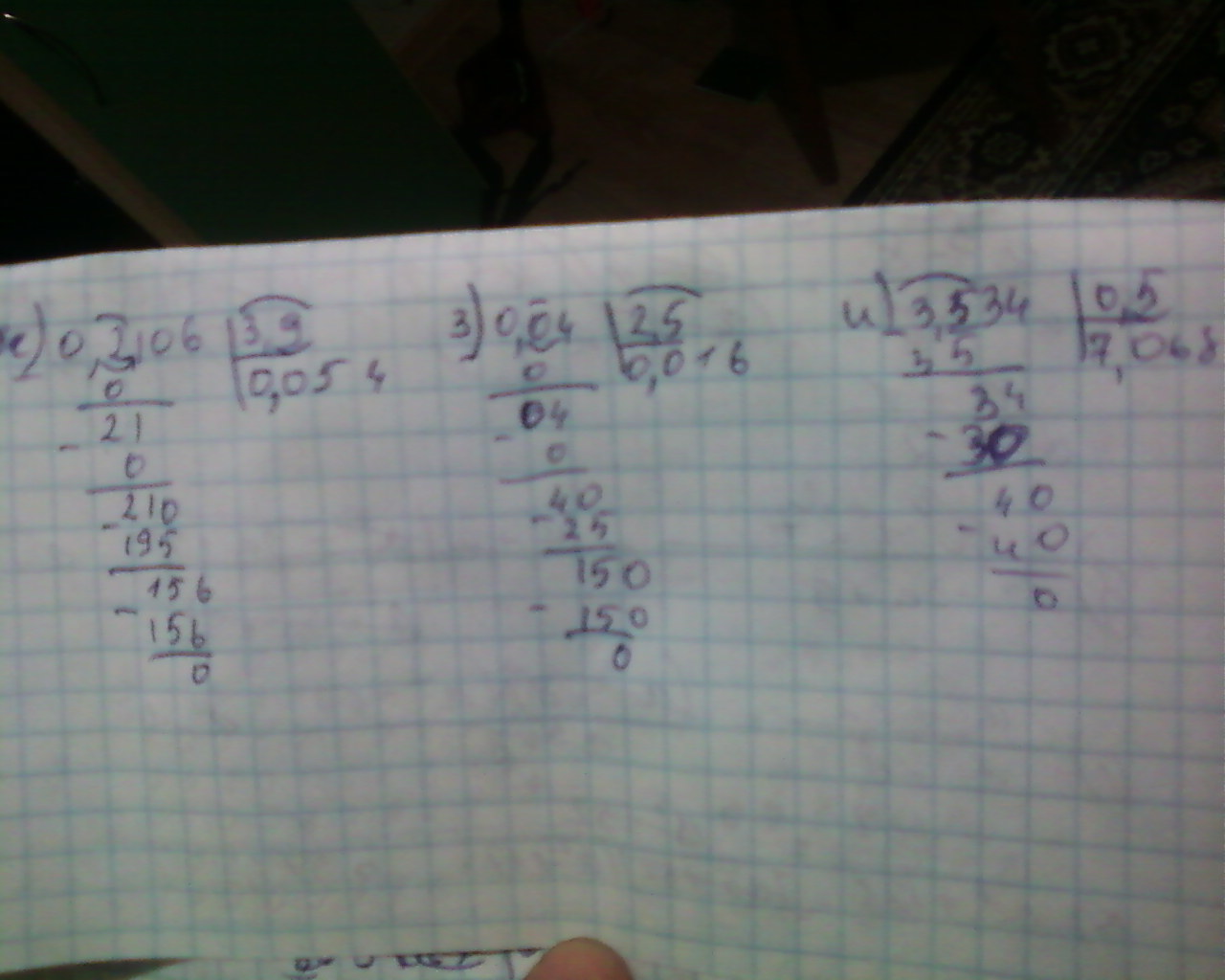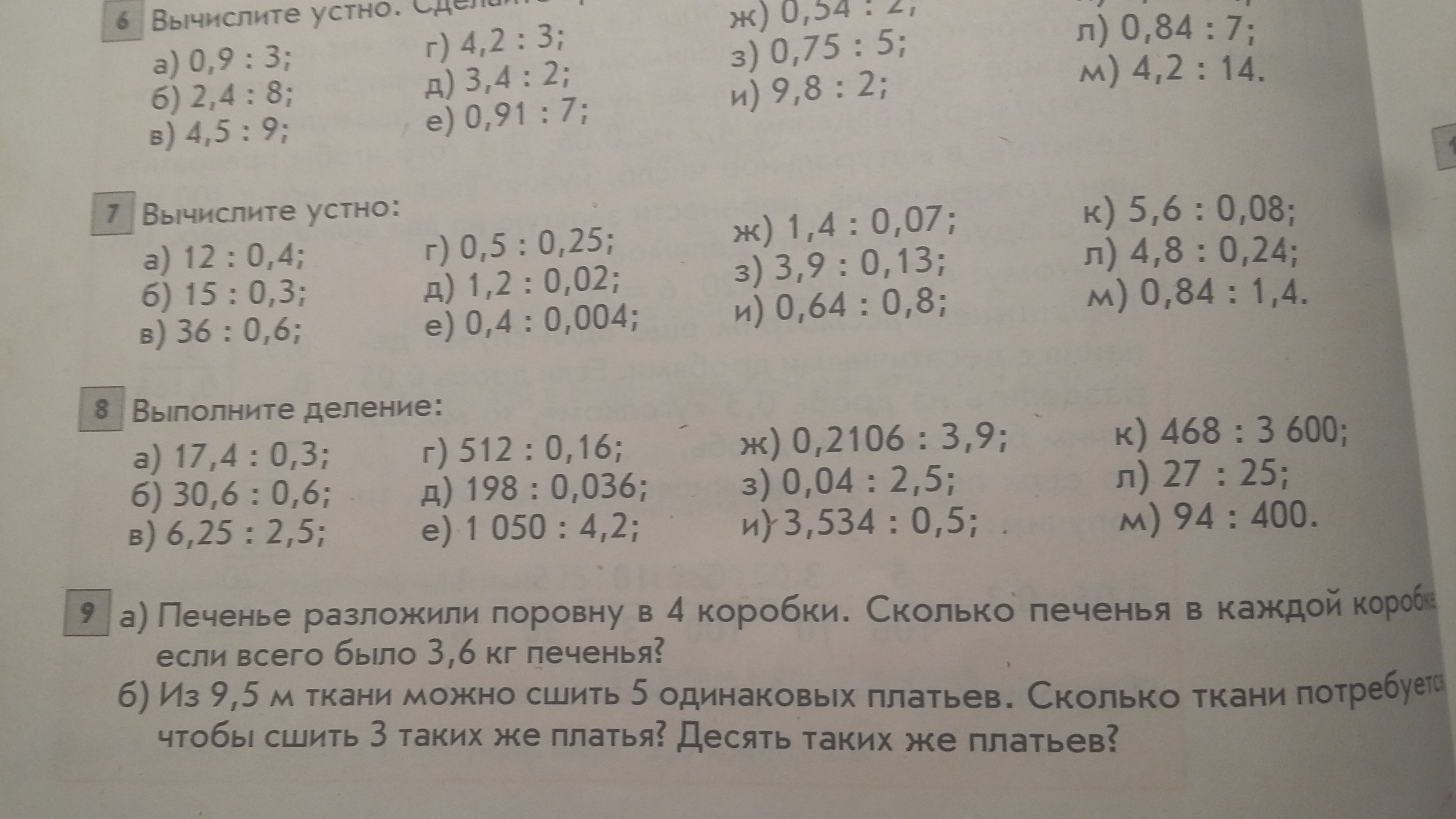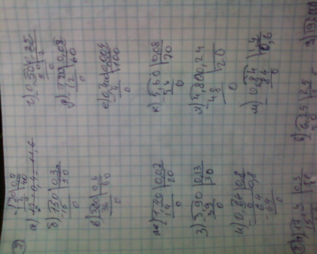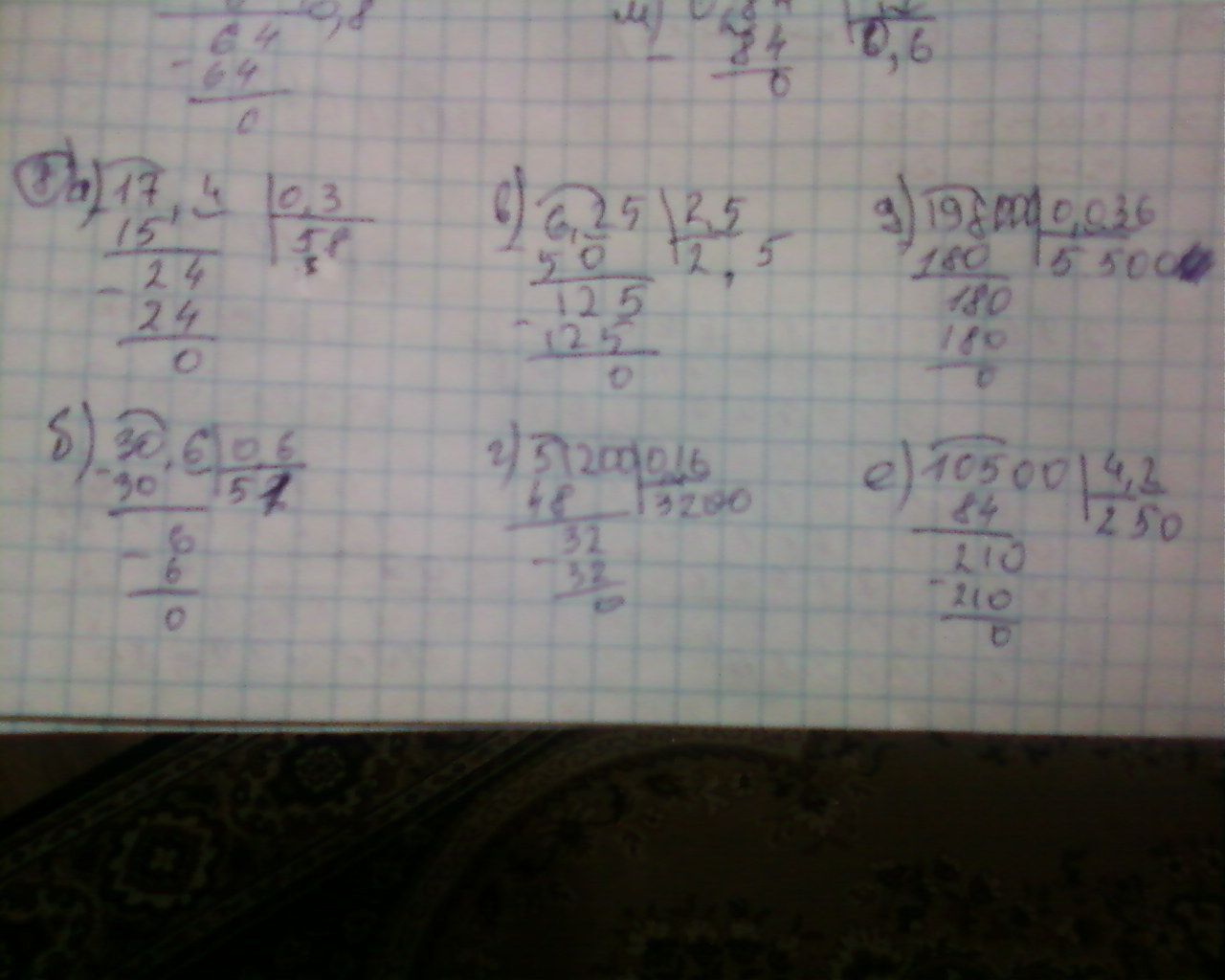 по аналогии остальные,для того чтобы решить нужно перевести запятые ,если цифры в делимом закончились,ты можешь добавить нули,а на десятичные дроби делить нельзя ,если не поймешь ,остальные напишу .