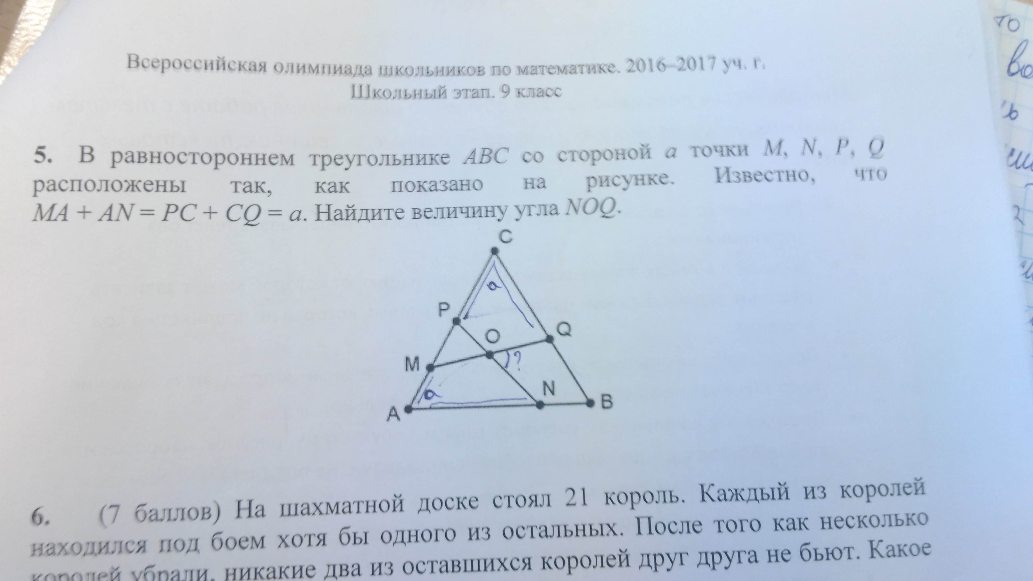 в равностороннем треугольнике ABC со стороной a точки M, N, P, Q расположены так, как показано на рисунке. Известно, что MA + AN = PC + CQ = a. Найдите NOQ