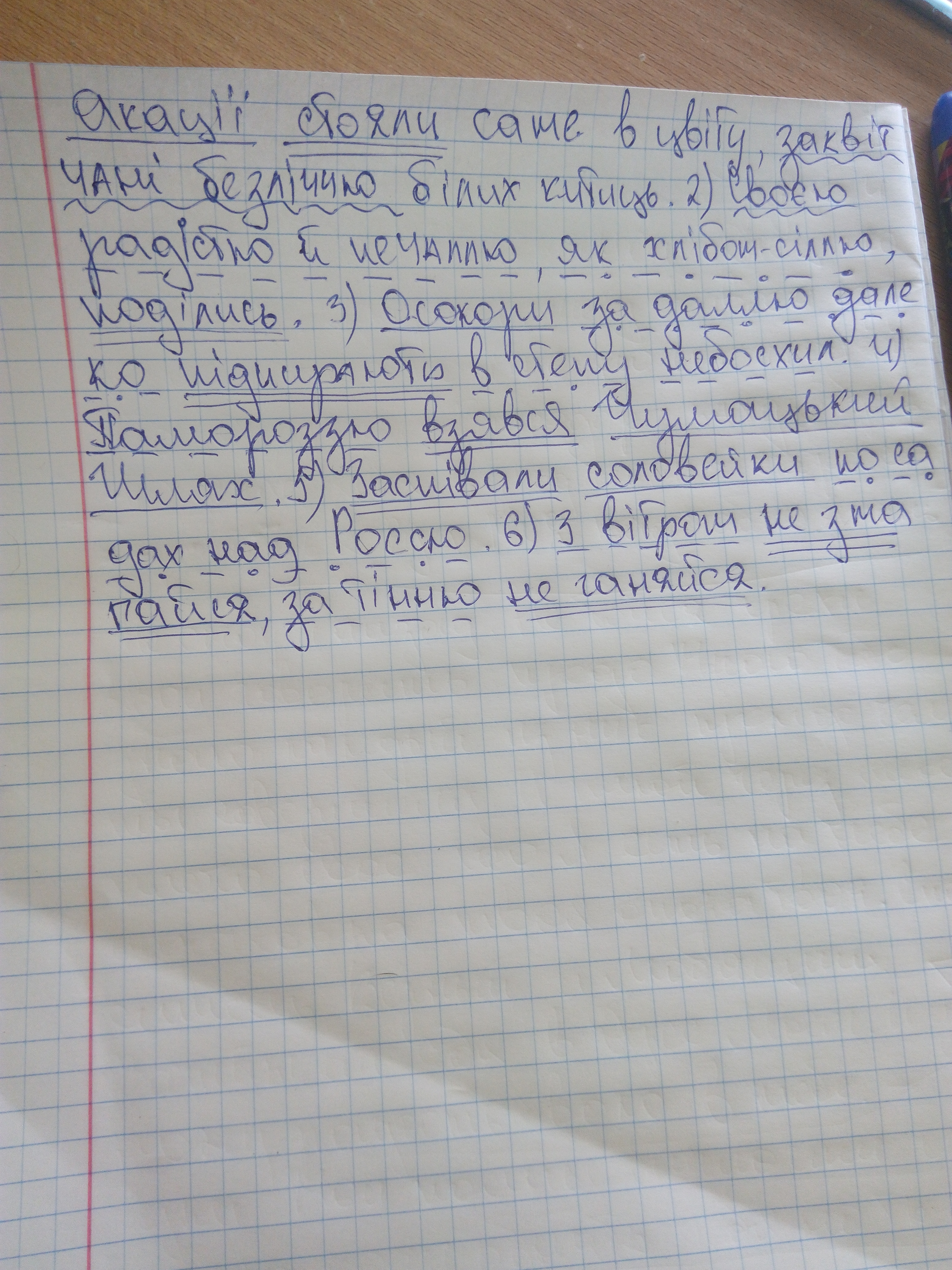 1.Акації стояли саме в цвіту,заквітчані (безліч) білих китиць.2.Своєю (радість) й (печаль),як (хліб-сіль),поділись.3.Осокори за (даль) далеко підпирають в степу небосхил.4.(Паморозь)взявся Чумацький Шлях.5.Заспівали соловейки по садах над (Рось).6.З вітром не змагайся,за (тінь)не ганяйся.