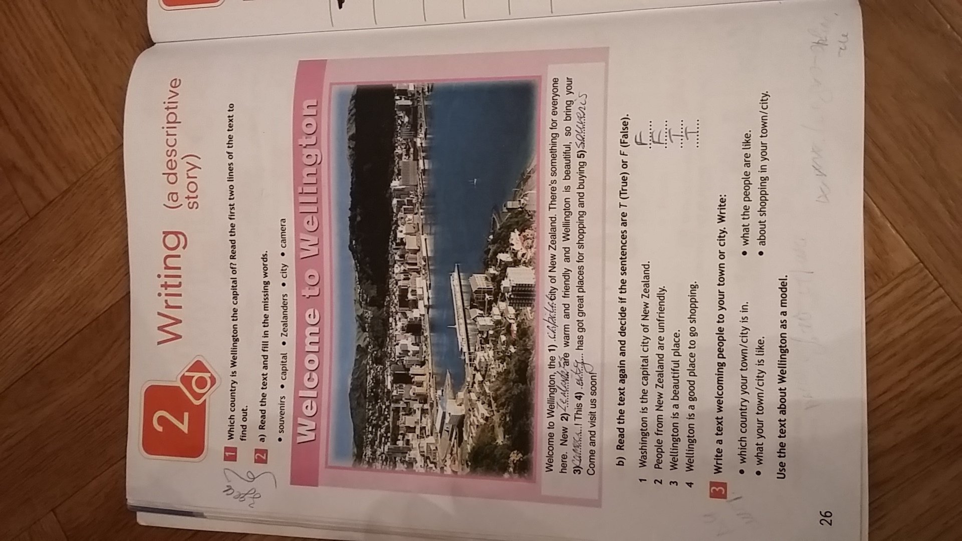 Добро пожаловать в Веллингтон, столицу Новой Зеландии. Здесь есть что-то для каждого. Новая Зеландия жаркая и дружелюбная и Веллингтон красивый,поэтому принесёт тебе(прости не понимаю подчерк).Этот город имеет хорошие места для шопинга и покупок(не понимаю что за слово написано).Приезжай и посети нас скорее.