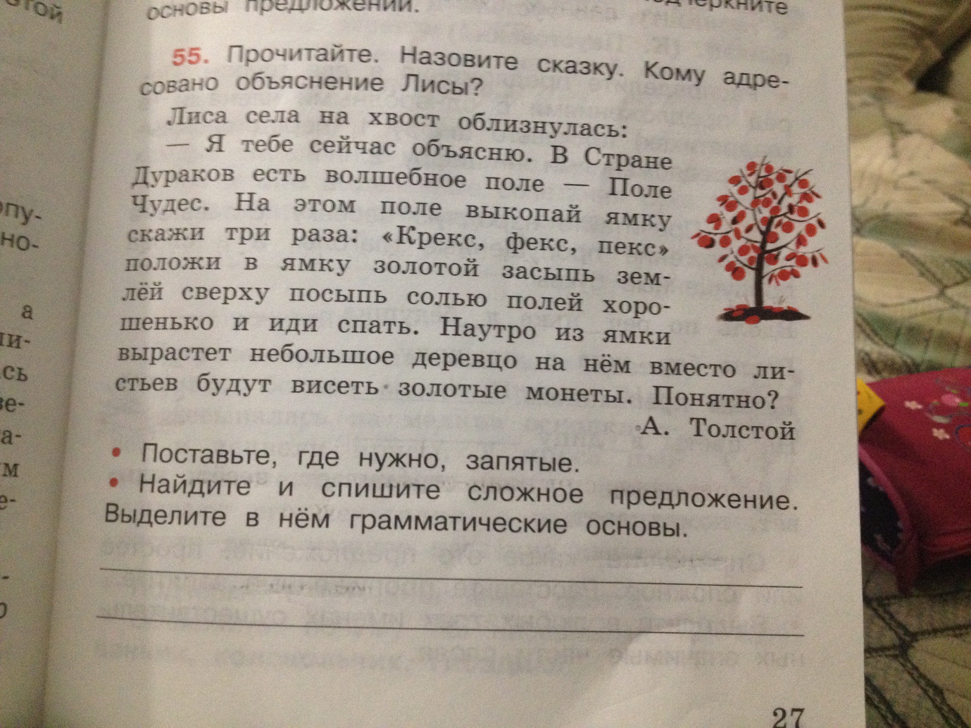 - Я тебе сейчас объясню. В Стране Дураков есть волшебное поле - Поле Чудес. На этом поле выкопай ямку, скажи три раза: "Крекс, фекс, пекс", положи в ямку золотой, засыпь землёй, сверху посыпь солью, полей хорошенько и иди спать. На утро из ямки вырастет небольшое деревце, на нём вместо листьев будут висеть золотые монеты. (подлежащее - деревце, монеты; сказуемое - вырастет, будут висеть) Понятно?