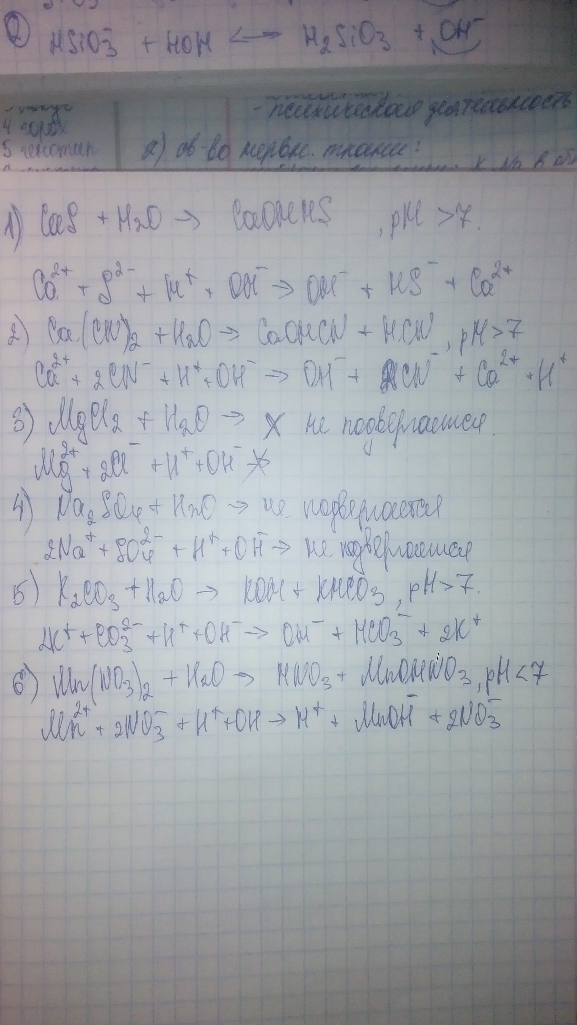 Составьте молекулярное и ионные уравнения гидролиза солей CaS, Ca(CN)2, MgCl2, Na2SO4, K2CO3, Mn(NO3)2. Каково значение pH(больше или меньше 7) в растворах каждой из этих солей? В растворах каких солей лакмус имеет синий цвет?