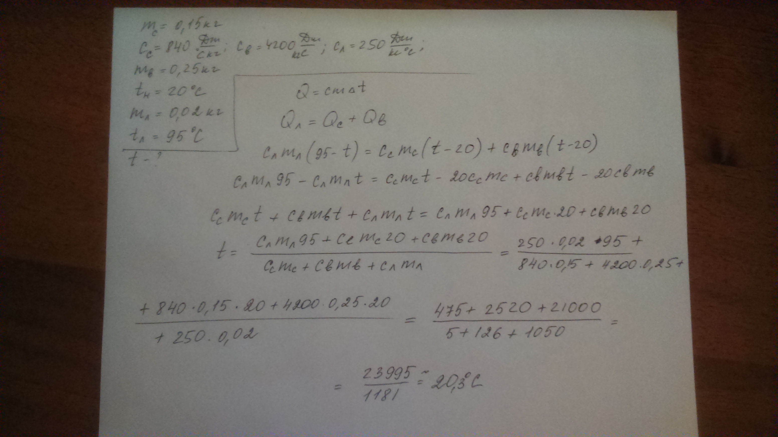 В стакан массой 150г. (предполагается, видимо, стеклянный) с водой массой 250г. при температуре 20г.ц по грузили серебряную ложку массой 20г. с температурой 95г.ц. Какова температура теплового равновесия?