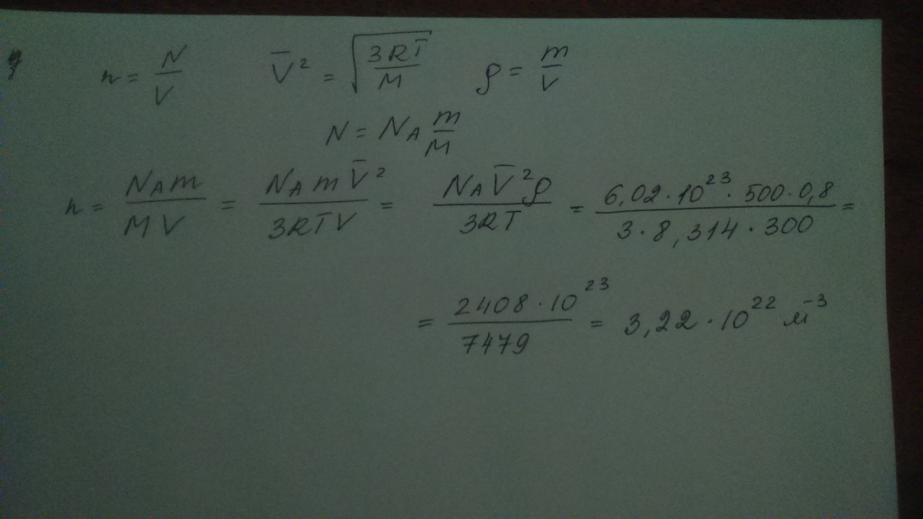 При температуре T = 300K средняя квадратичная скорость молекул газа v = 500 м/с , а плотность газа ρ = 0,8 кг/м . Найдите концентрацию молекул газа.