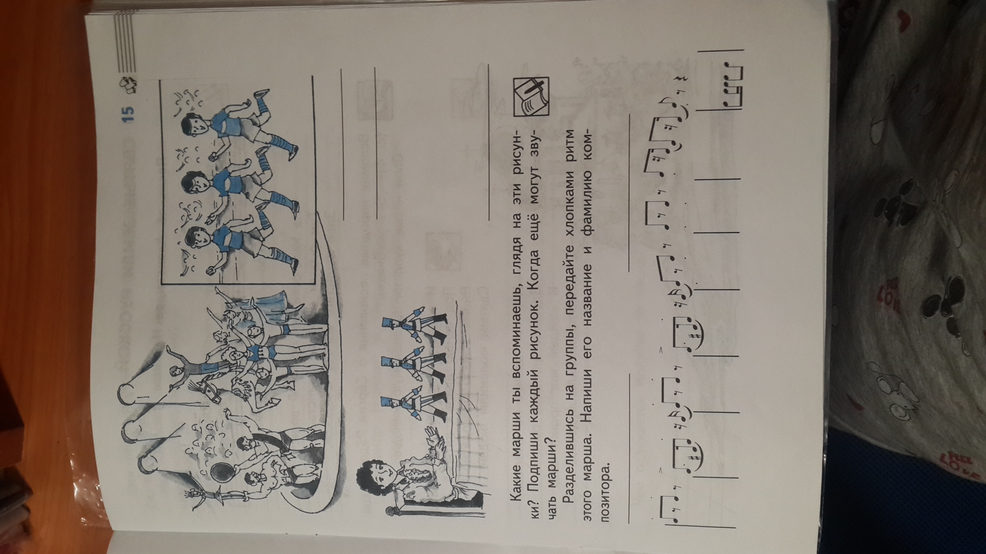 Какие марши ты вспоминаешь, глядя на эти рисунки? Подпиши каждый рисунок. Когда еще могут звучать марши? Разделившись на группы,передайте хлопками ритм этого ритма. Напиши его название и фамилию композитора.