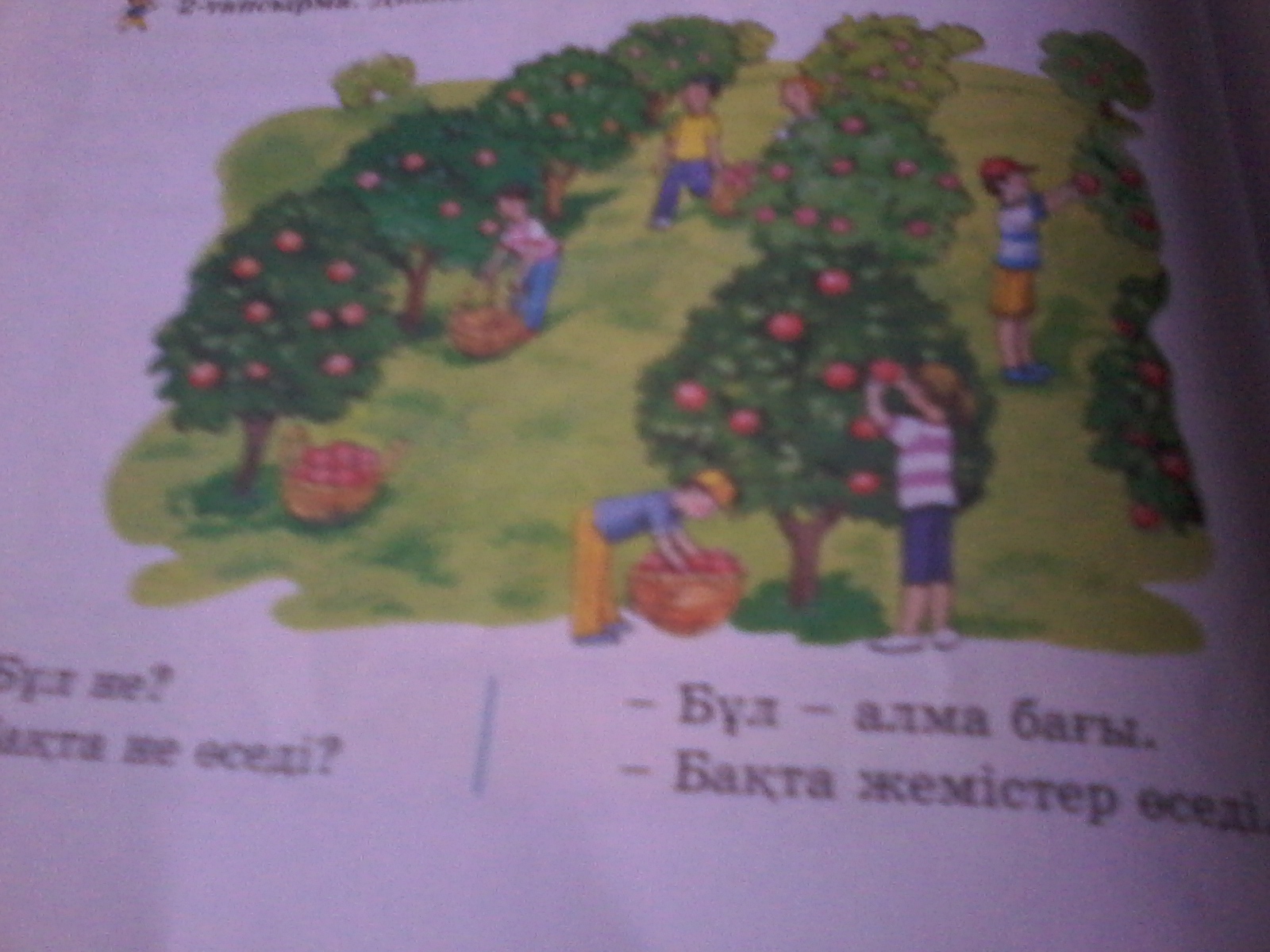 Бұл - алма бағы. Бақта жемістер өседі. Біз алмаларды жинайдық. Олар өте дәмді екен! (дальше сам (а))