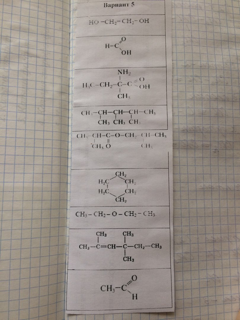 Вариант 5. Этиленгликоль или этан-1,2-диол ; метановая или муравьиная кислота ; 2-амино-2-метилмасляная кислота ; 2,3,4-триметилпентан ; изобутиловый эфир изомасляной кислоты(2-метилпропионовой) ; циклогексан ; 1-этоксиэтан или диэтиловый эфир ; 2,4,4-триметилгексен-2 ; ацетальдегид или этаналь.
