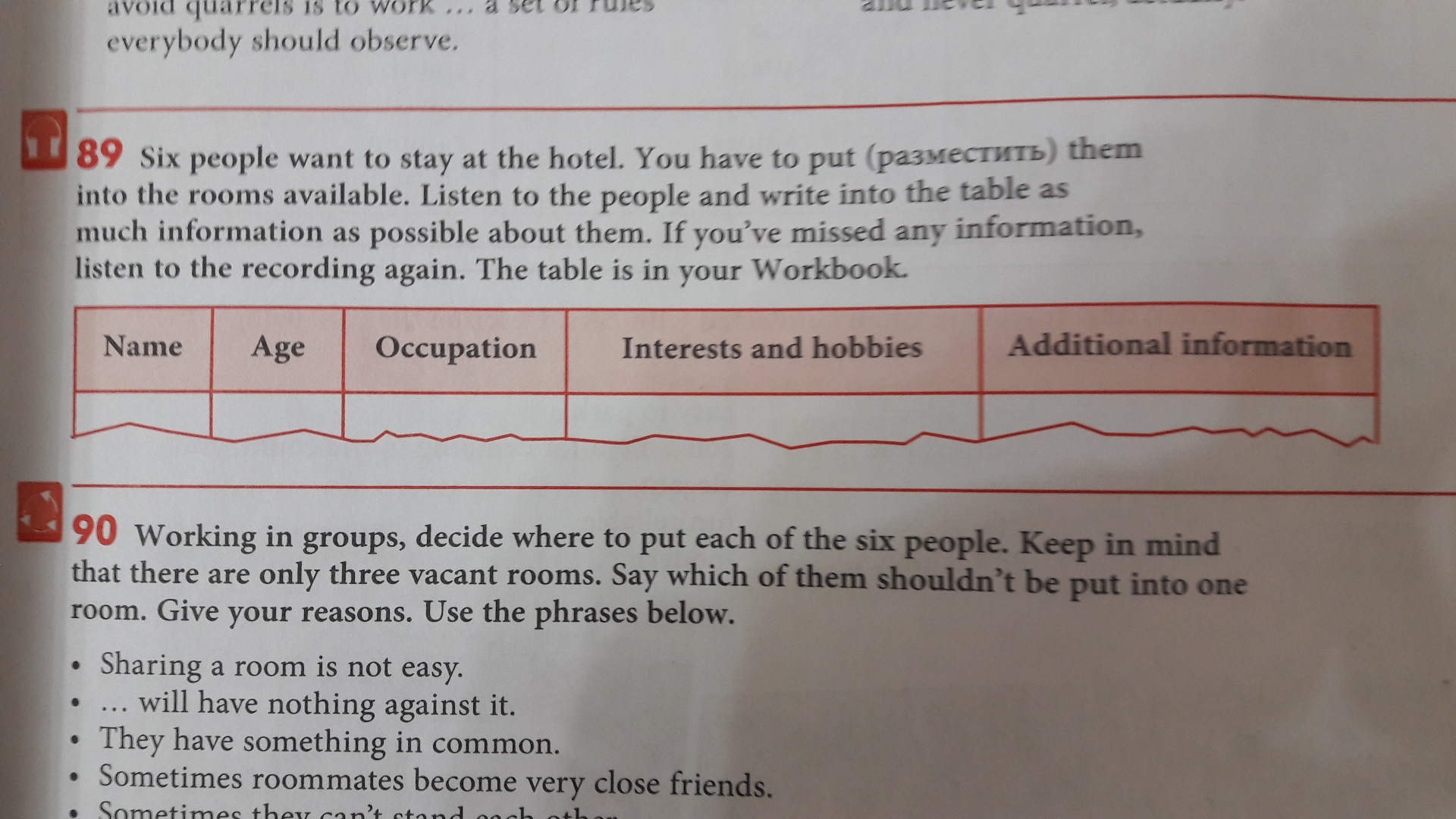 шесть человек хотят остановиться в отели. вам надо разместить их в свободных комнатах. прослушайте людей и впишите в таблицу как можно больше инфорации о каждом из них.