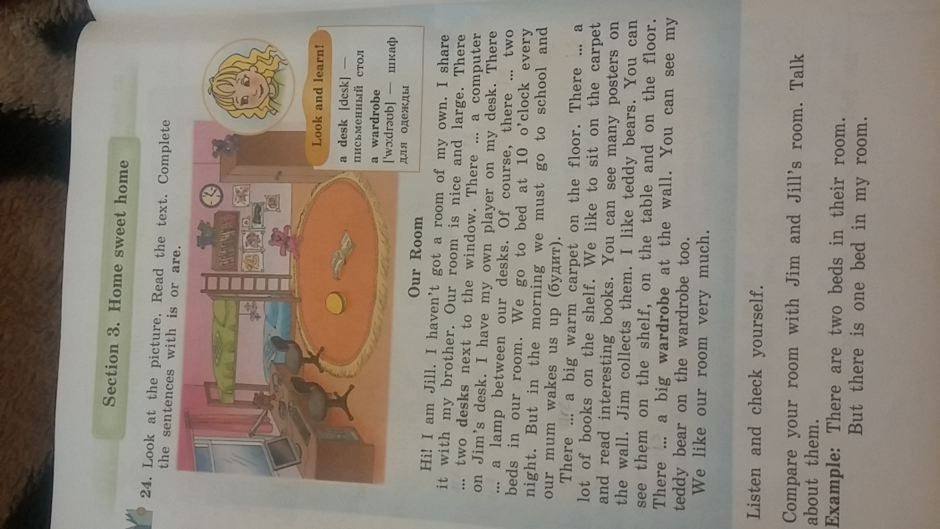 Привет ,меня зовут Джилл. У меня нет собственной комнаты .Я делюсь ею со своим братом. Наша комната большая и красивая. Рядом с окном находится 2 стола. На столе у Джима компьютер. У меня есть собственный игрок на столе. Между нашими столами находится лампа. Ну и конечно, в нашей комнате имеется 2 кровати. каждую ночь мы ложимся спать в 10:00 вечера. А утром мы должны вставать и идти в школу ,и наша мама будет нас. На полу находится большой ,теплый ковер. На полке есть много книг.Нам нравится сидеть на ковре ,читать интересные книги. Ты можешь увидеть много постеров на стене. Джим коллекционирует их.Мне нравятся плюшевые мишки. ты можешь увидеть их на полках ,на столе и на полу. У стены большой гардероб .Ты также сможешь увидеть моего плюшевого мишку на гардеробе. Нам очень нравится наша комната.