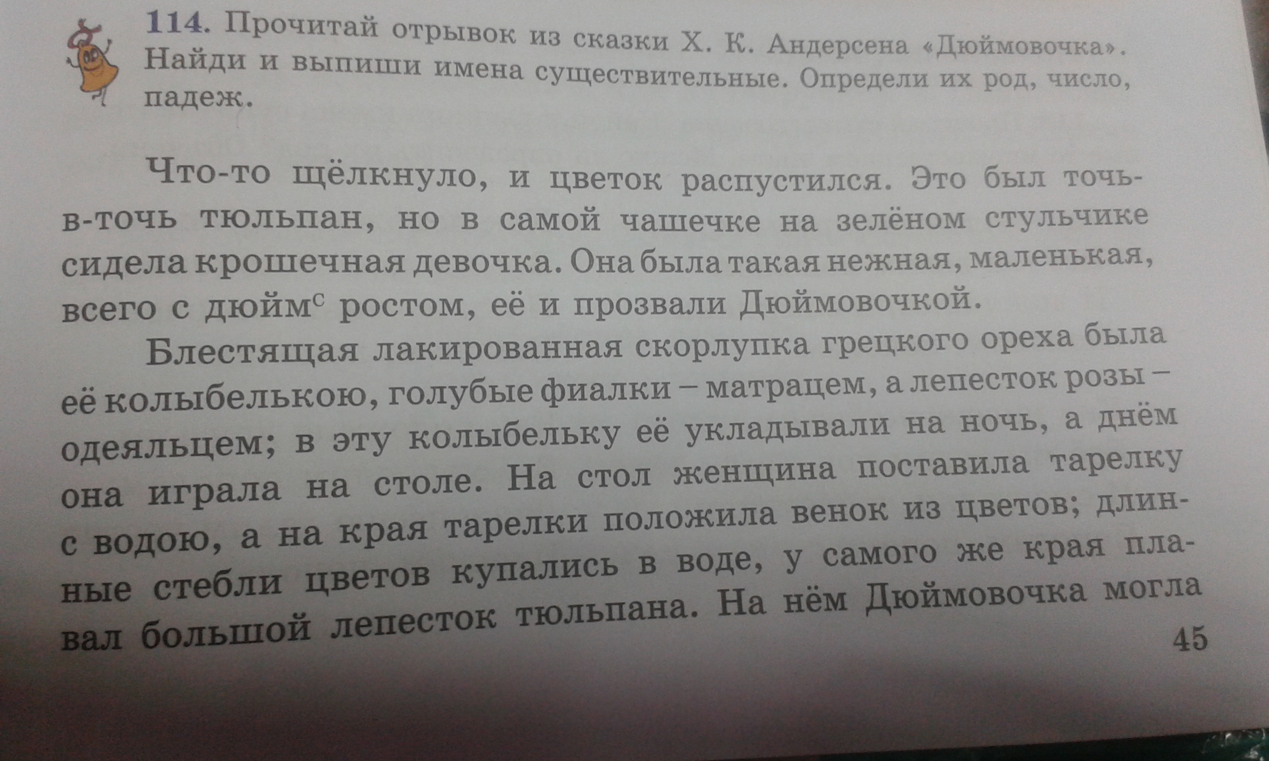 прочитай отрывок из сказки Х. К.Андерсена ''дюймовочка''.найди и выпиши имена существительные.определи из род число падеж.Что-то щёлкнуло и цветок распустился.это был точь-в-точь тюльпан,но в самой чашечке на зеленом стульчике сидела крошечная девочка.Она была такая нежная маленькая всего с дюйм ростом,её и прозвали Дюймовочкой.Блестящая лакированная скорлупка грецкого ореха была её колыбелькою голубые фиалки матрацем а лепесток розы одеяльцем в эту колыбельку её укладывали на ночь а днем она играла на столе.На стол женщина поставила тарелку с водою а на края тарелки положила венок из цветов;длинные стебли цветов купались в воде,самого же края плавал большой лепесток тюльпана.на нём Дюмовочка могла переправляться с одной стороны тарелки на другую;вместо вёсел у неё были два белых конских волоса.все это было прелесть как мило!