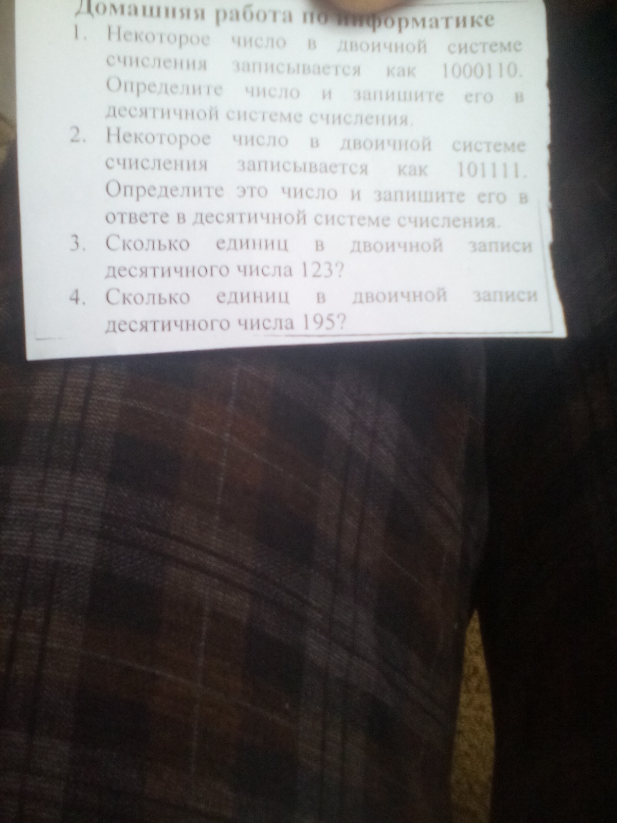 чтобы 195 перевести в двоичную нужно из этих чисел выделить те, которые если их сложить дают 195, вот эти числа: 128, 64, 32, 16, 8, 4, 2, 1. Складываем 128+4+2+1=195. Те числа которые мы сложили чтобы получить 195 нужно под ними поставить единицу, а те которые мы не сложили поставить под ними ноль. Сложили четыре числа и получились 4 единиц.