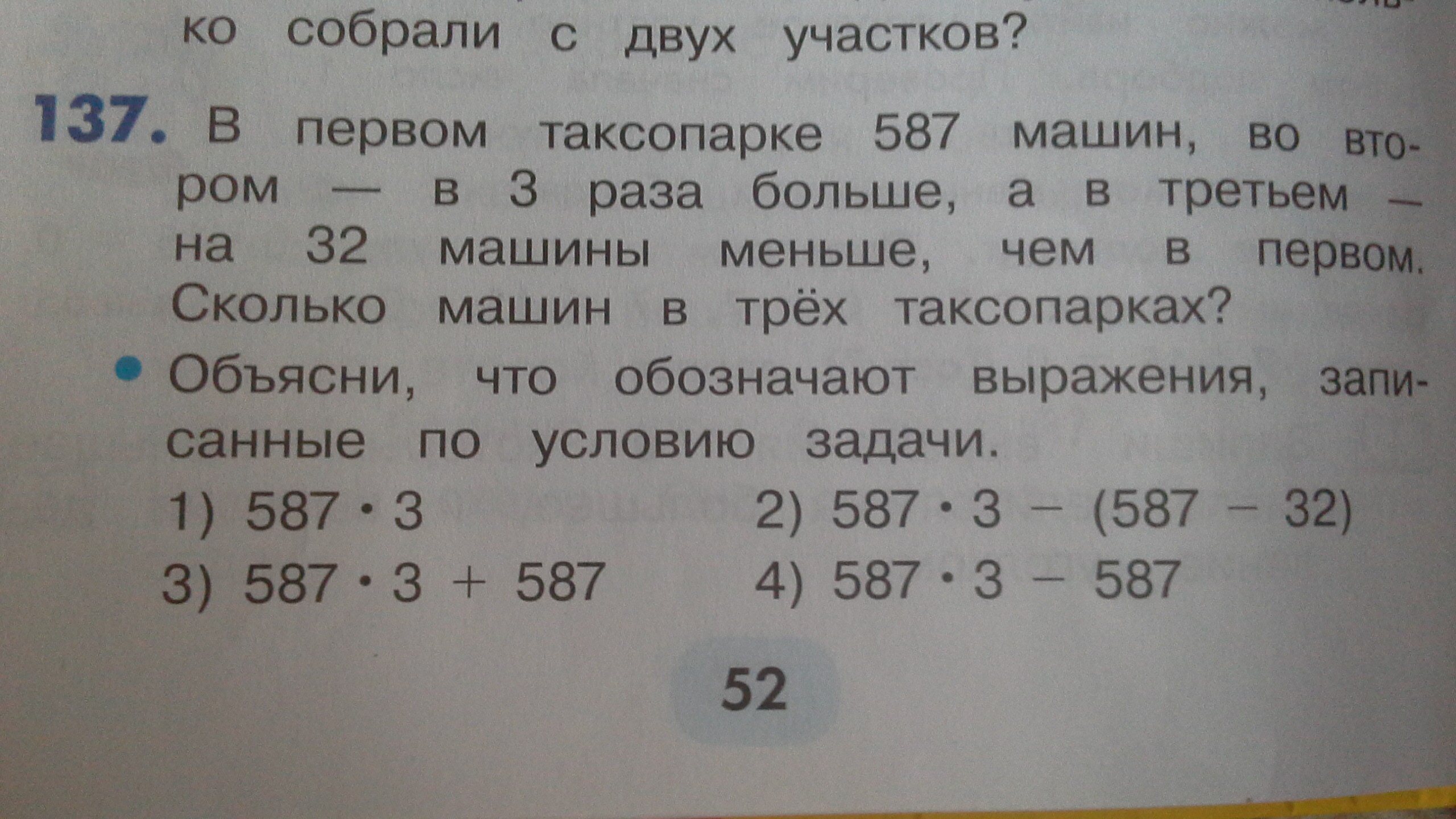 в первом таксопарке 587 машин во втором в 3 раза больше а встречи на 32 машины меньше чем в первом сколько машин из 3 таксопарк Объясни что обозначают выражения записанные По условию задачи